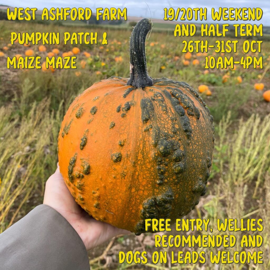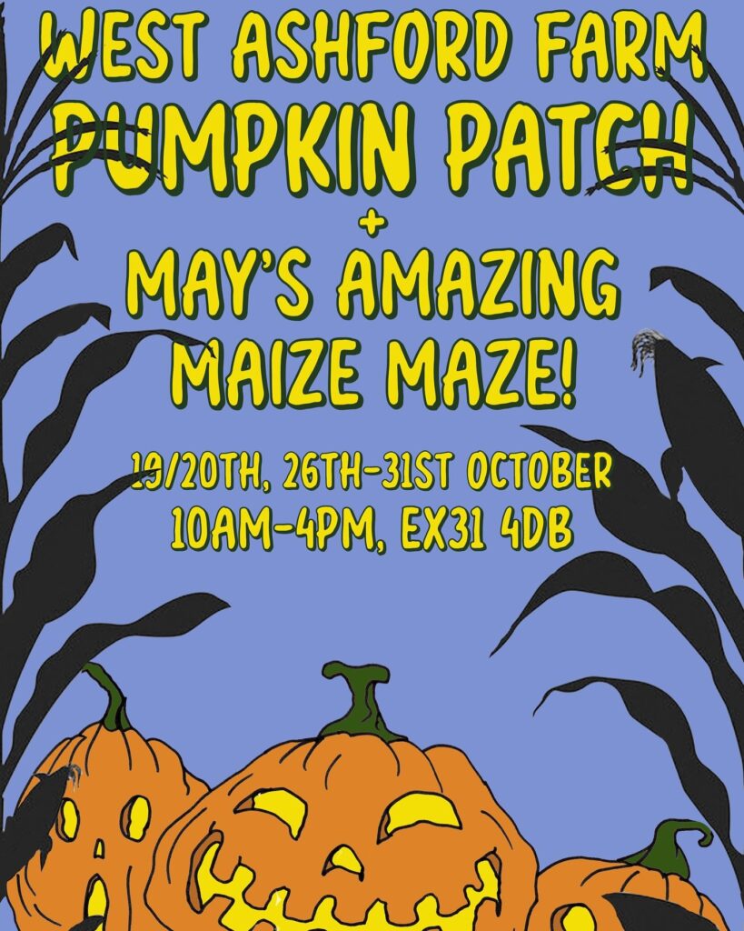 West Ashford Pumpkin Patch & May’s Amazing Maize Maze: Open from Saturday 26th – Thursday 31st, 10am–4pm. Dogs welcome on leads; cash and card accepted. Don’t miss the maze—wellies are strongly advised for this one!