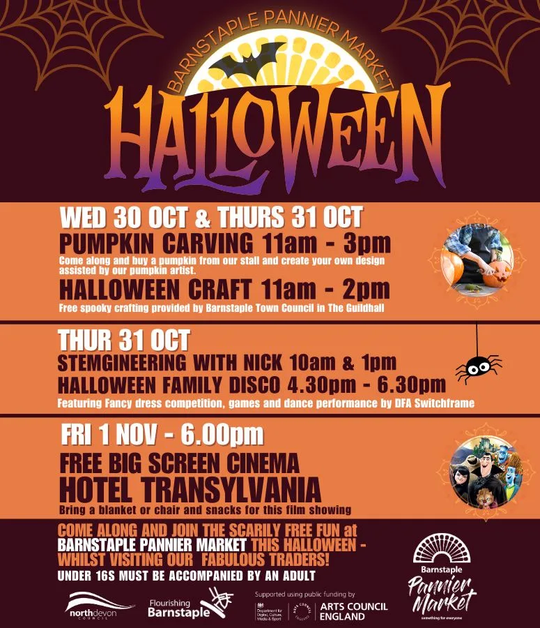 Enjoy free family half-term fun at Barnstaple Pannier Market, with events running from 30th October – 1st November. Highlights include a Halloween Disco on the 31st from 4:30–6:30pm and a big-screen showing of Hotel Transylvania on 1st November at 6pm (bring a blanket and chair!). Spaces are limited, so arrive early to secure your spot.