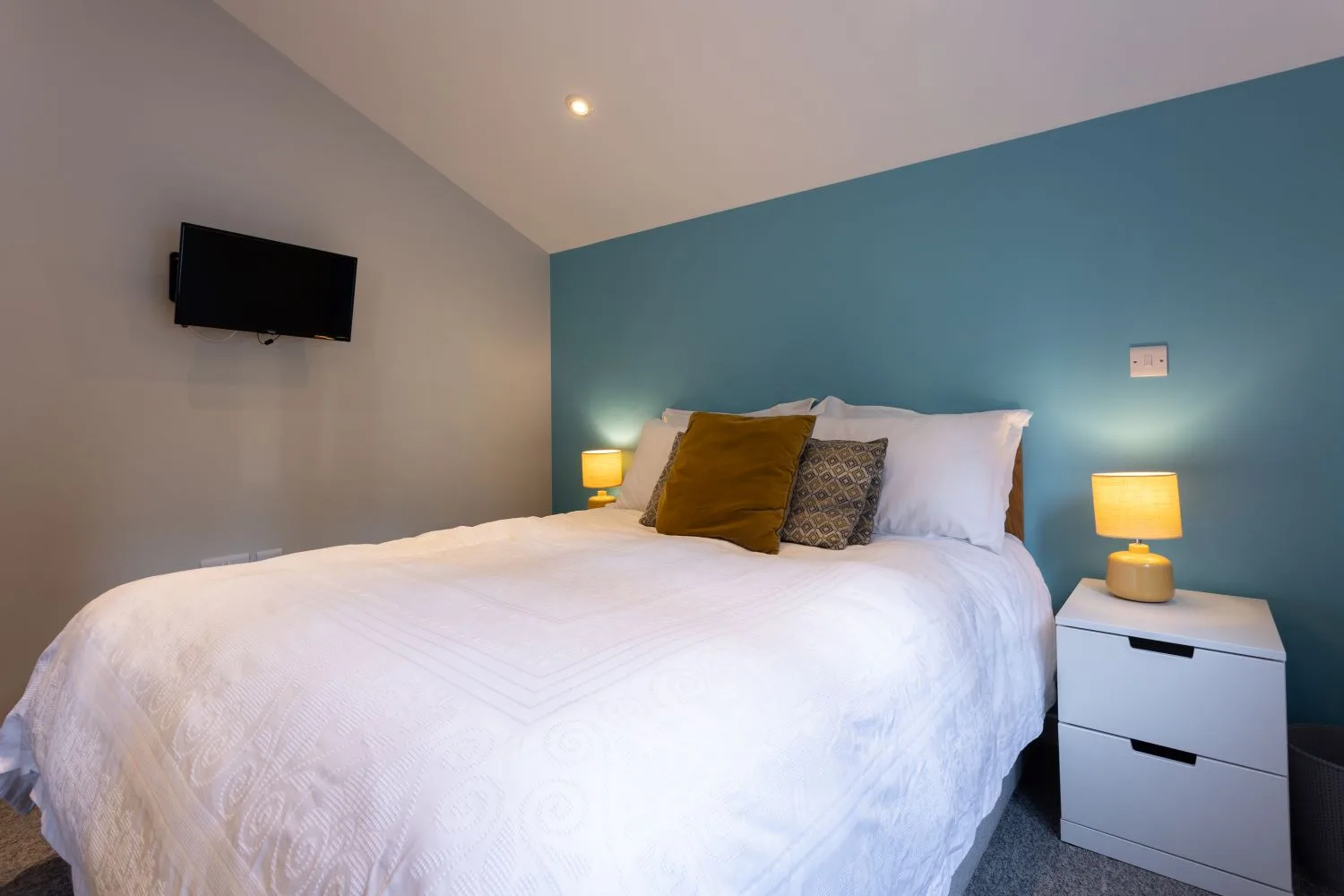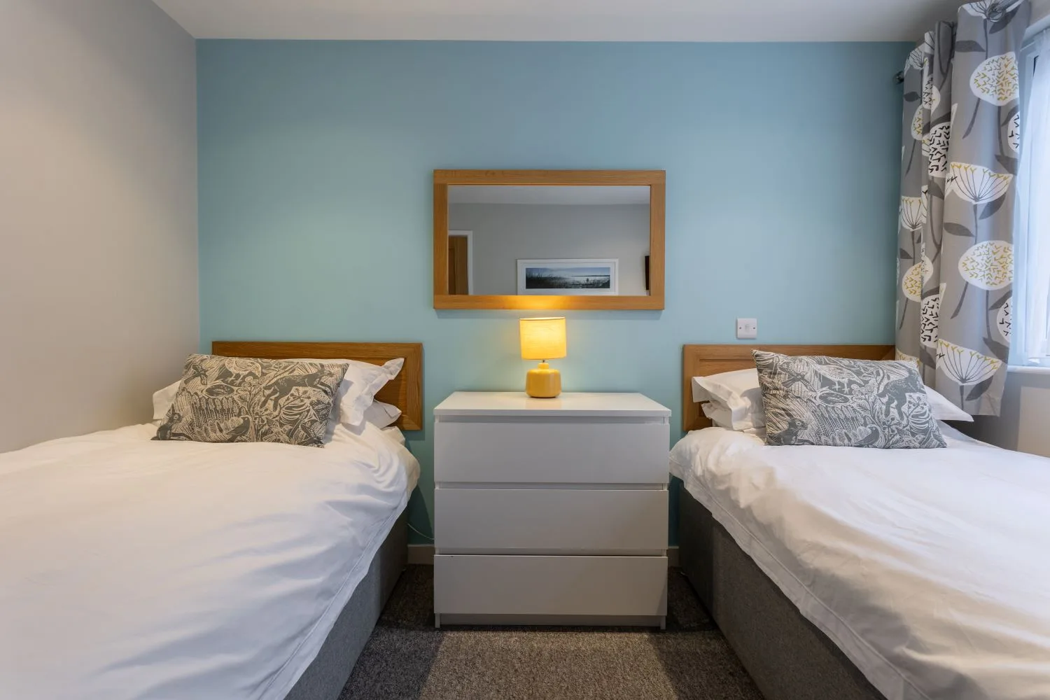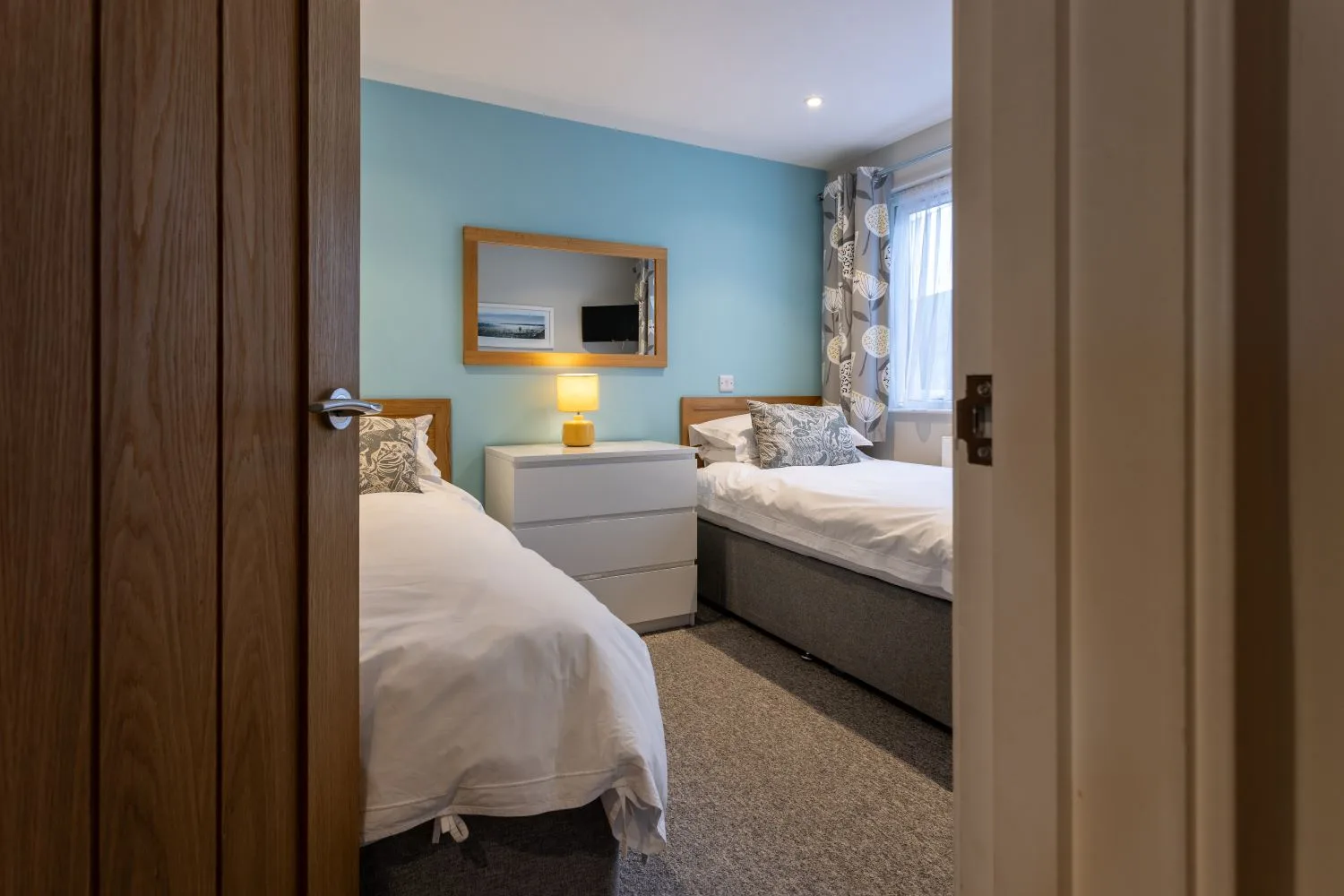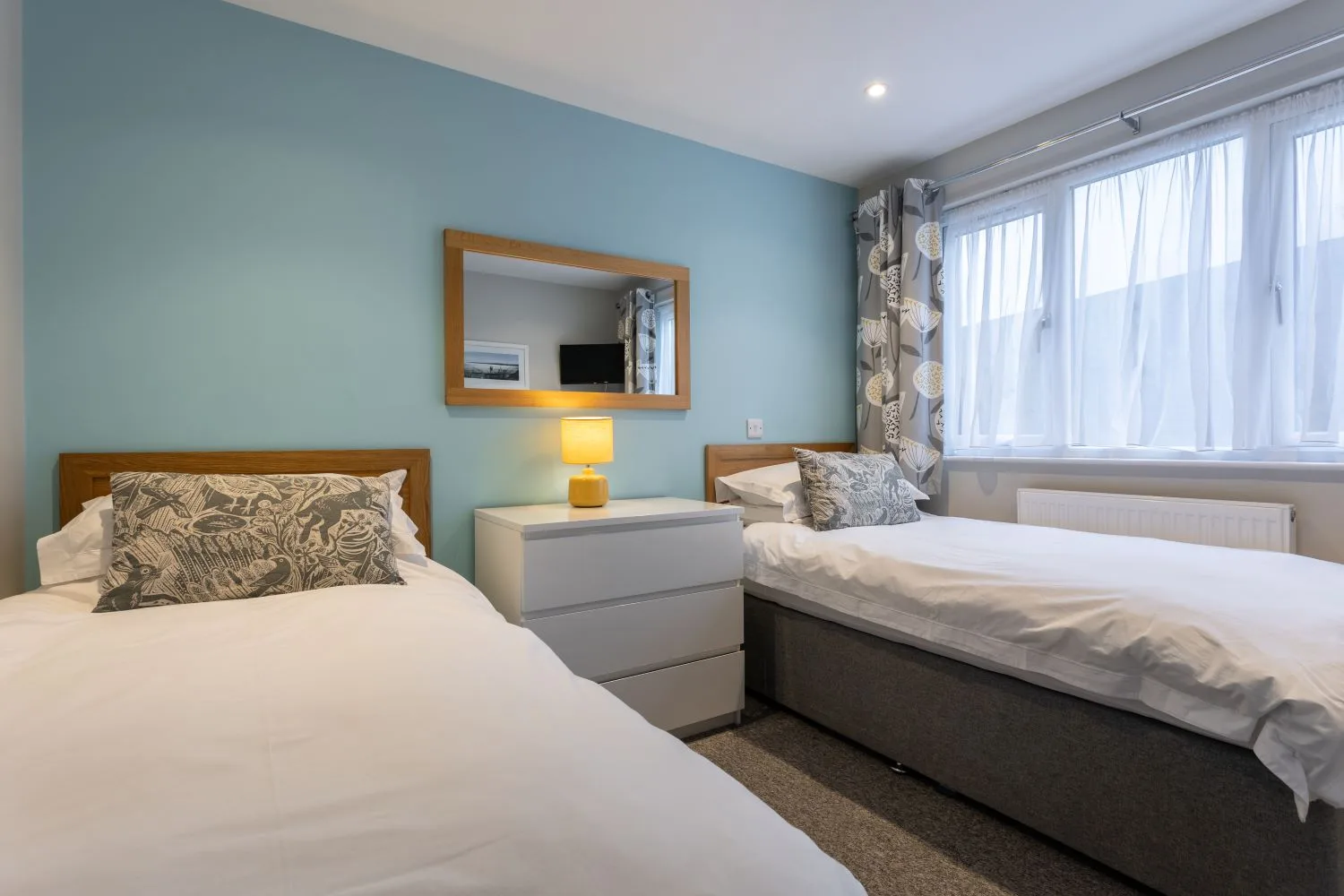 Bedroom 2: Twin beds with built in wardrobe, chest of drawers and Smart TV.