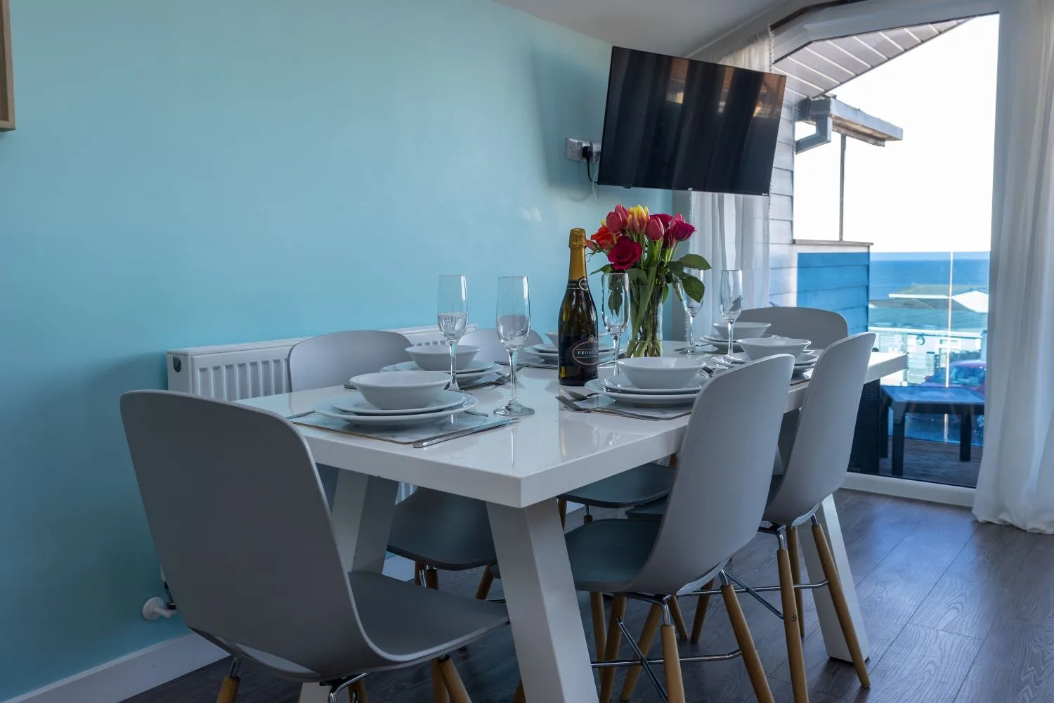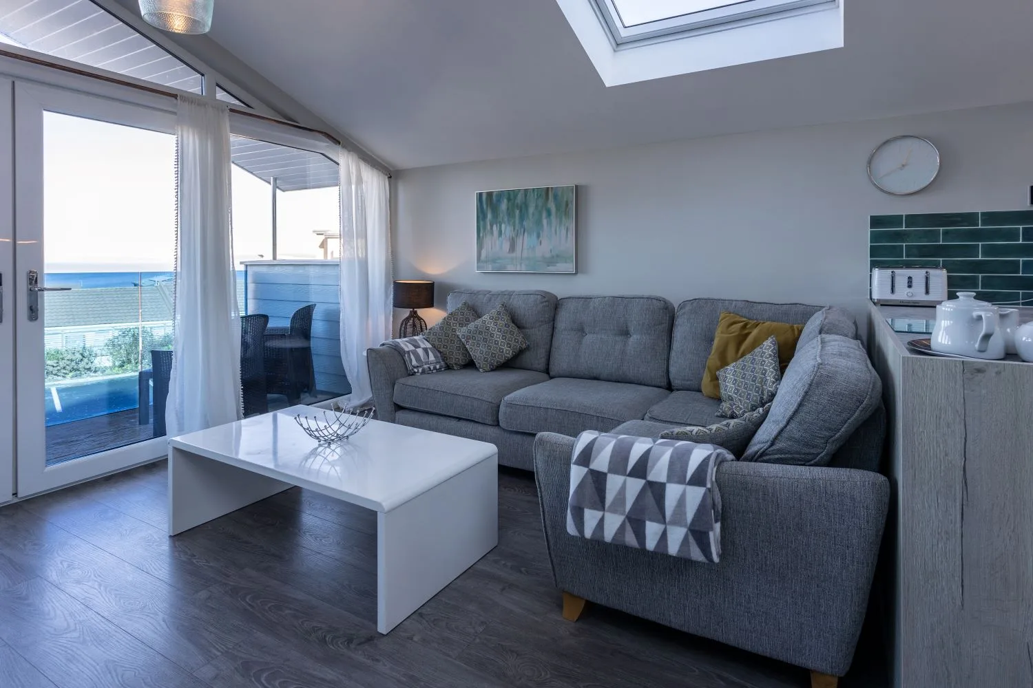 Living room: A large comfortable corner sofa, large Smart TV and a dining table with 4 chairs that provides a lovely setting to enjoy an evening meal. Patio doors provide access onto the balcony. The perfect spot to sit back and enjoy the wonderful sea views. Balcony furniture provided.