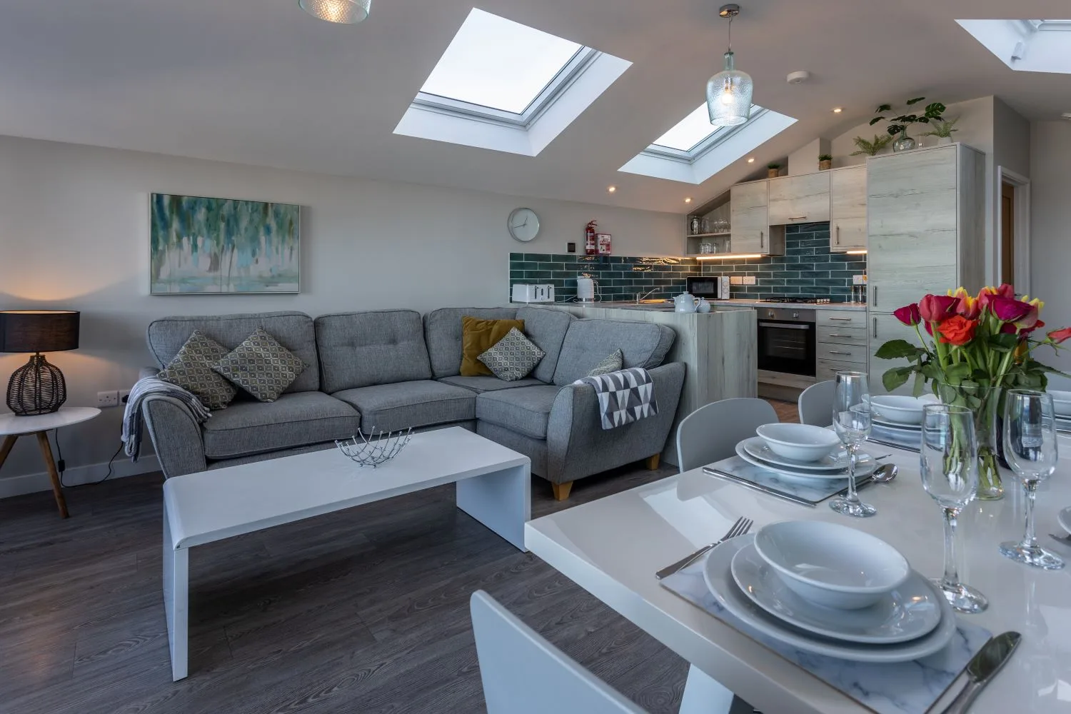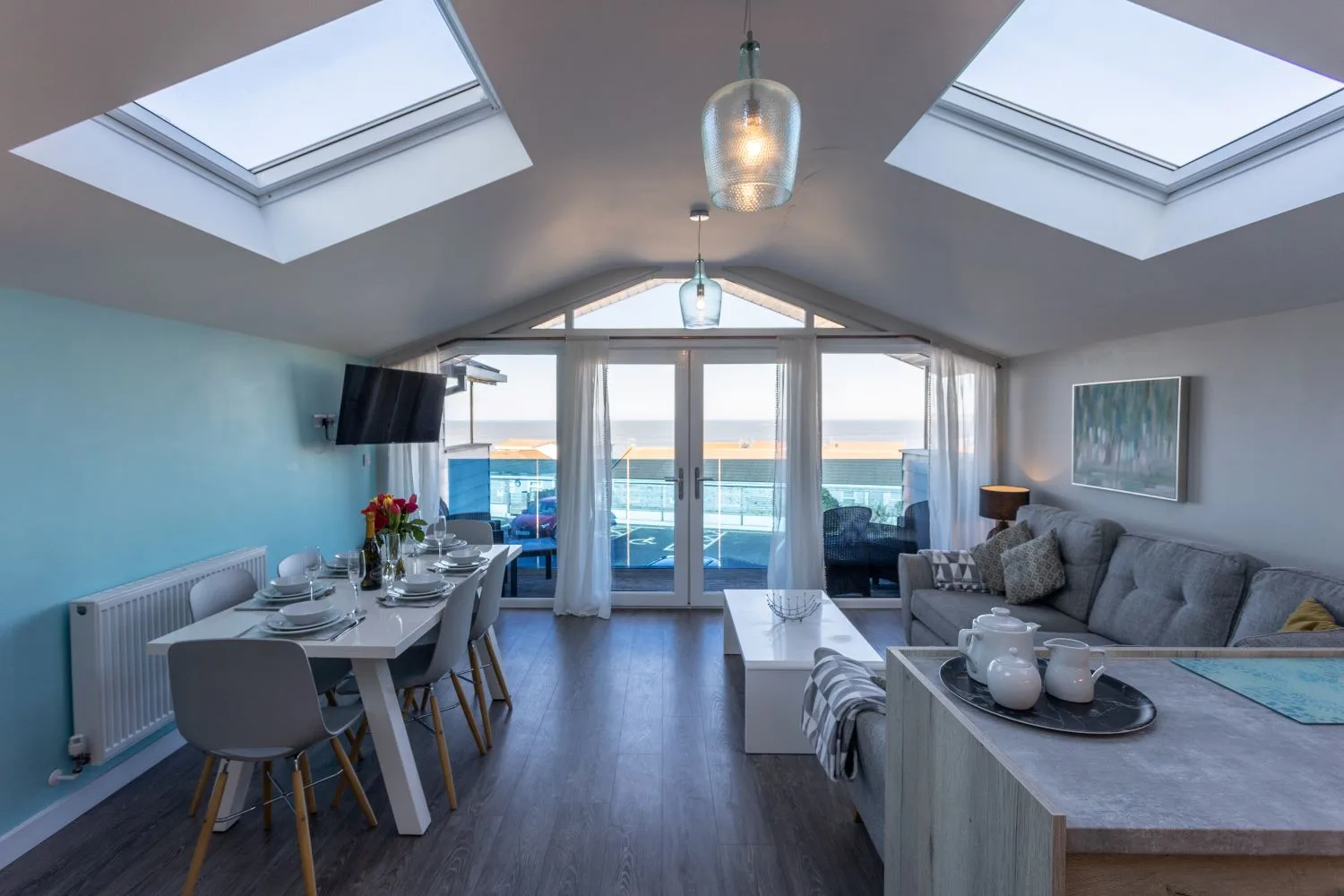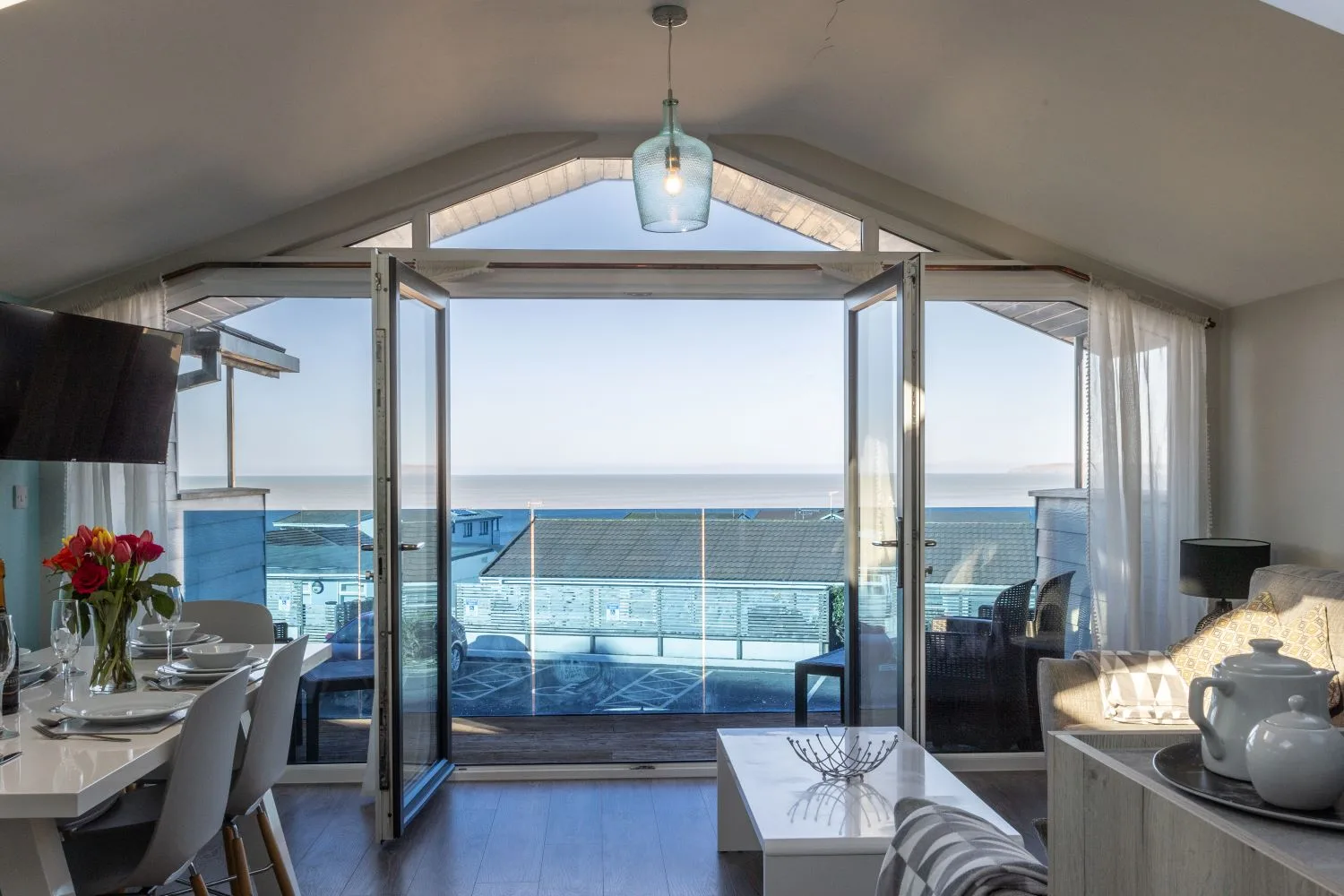 Stairs from the entrance hall lead up to the large open-plan living area on the first floor, which has patio doors opening onto a furnished balcony, perfect for chilling out after a day on the beach. The modern kitchen has all you need to rustle up a delicious evening meal, whether you choose to dine indoors or al fresco on the balcony. The lounge area with large corner sofa, additional seating, large Smart TV and dining area provides a comfortable social space. The balcony leads out from the living area and provides the perfect place to sit back and enjoy the far reaching sea views.