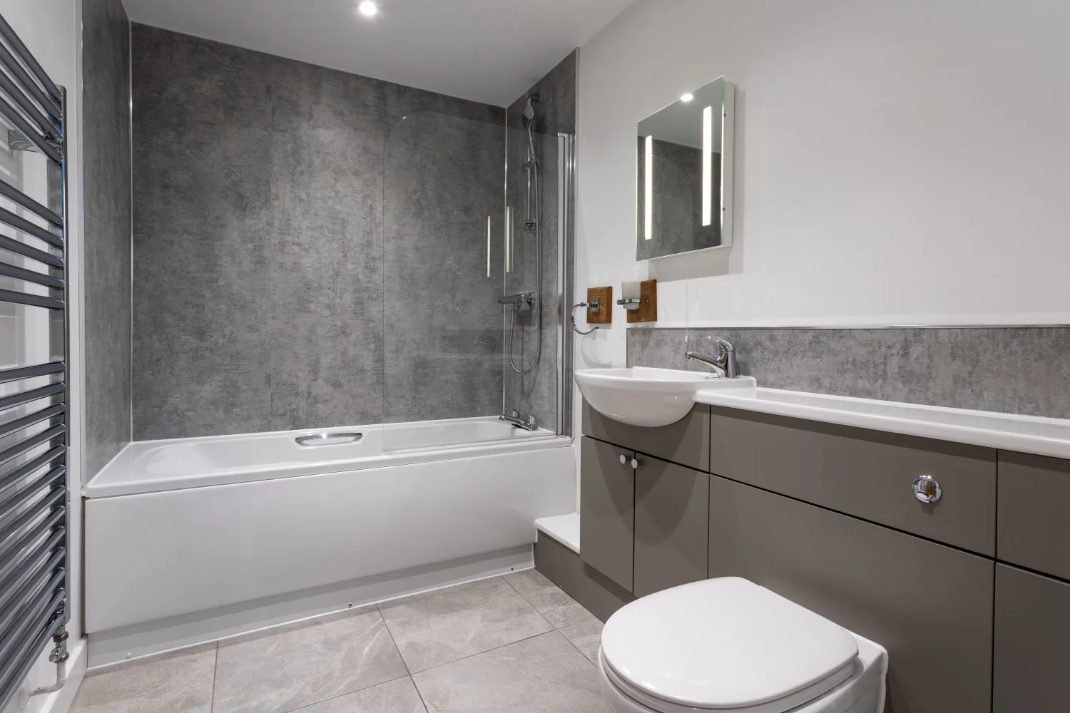 Bathroom: Bath with shower over, wash basin, WC and heated towel rail.
