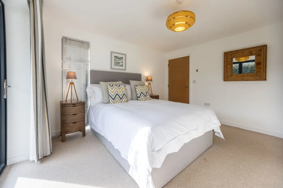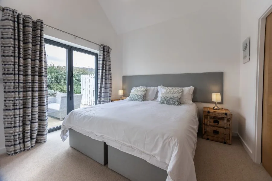 Bedroom 1 (Ground Floor): King-size room with large built-in wardrobe, bedsides, Smart TV and bi-fold doors opening out on the patio and garden. En-suite bathroom with shower cubicle, heated towel rail, WC and wash basin.