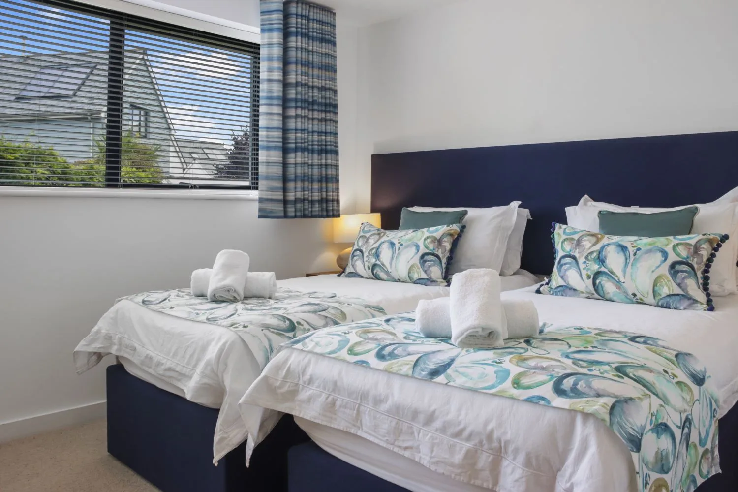 Bedroom 3 (Ground Floor): Pair of twin beds and large picture window overlooking the garden.