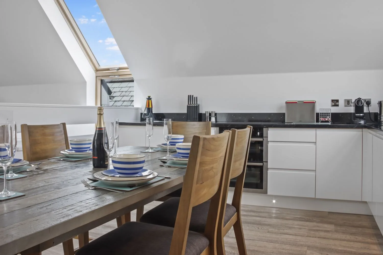 Kitchen Area: Well-equipped modern, fitted kitchen with Neff electric oven and induction hob, microwave, toaster, electric kettle, Nespresso coffee machine, dishwasher, integrated fridge, freezer, variety of kitchen utensils. There is also a dining table and chairs for 6 people.