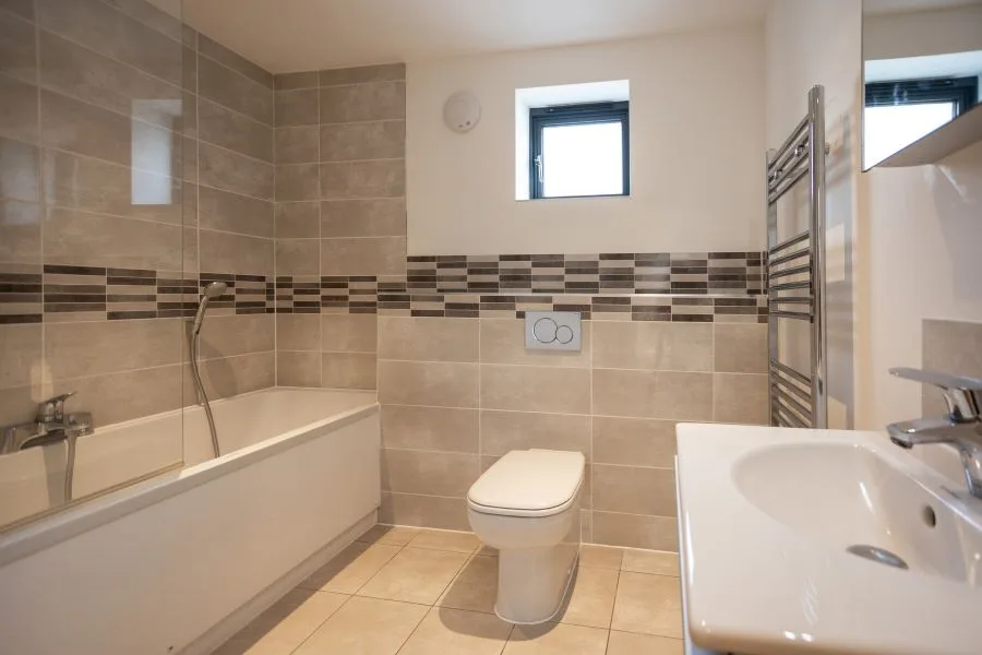 Bathroom (Ground Floor): Beautifully tiled and spacious main bathroom with bath and rain shower over bath with attachment, washbasin, WC and heated towel radiator.