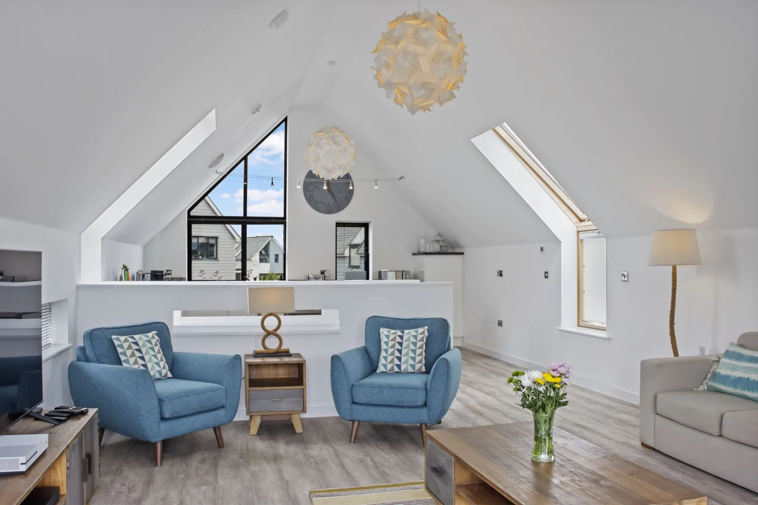 This reverse-level house is expertly designed to maximize breathtaking countryside and distant sea views. The three inviting bedrooms are situated on the ground floor. A spacious super king-size bedroom with an en-suite shower room, a king-size room with a Smart TV and en-suite shower room, and a cosy twin room. Both the super king and king-size bedrooms open onto a delightful patio and garden area, perfect for leisurely mornings with your coffee. The bathroom features a luxurious rain shower over the bath, and there’s a convenient utility room for all your needs, from washing facilities to surfboard storage.