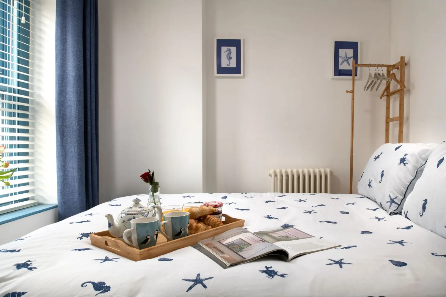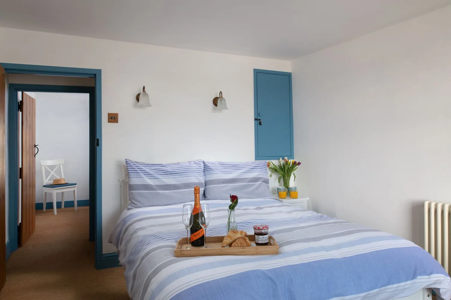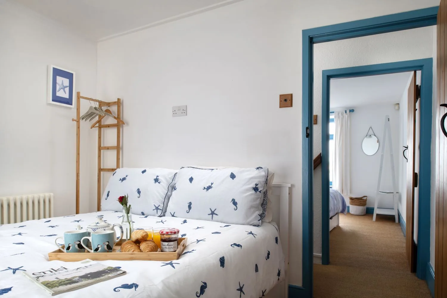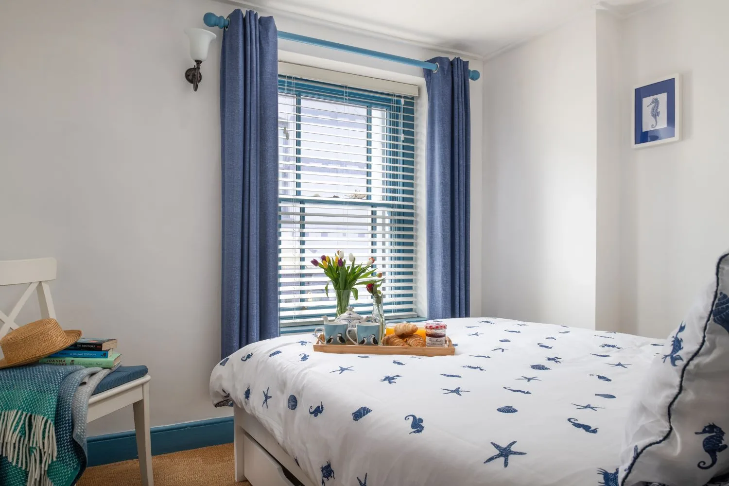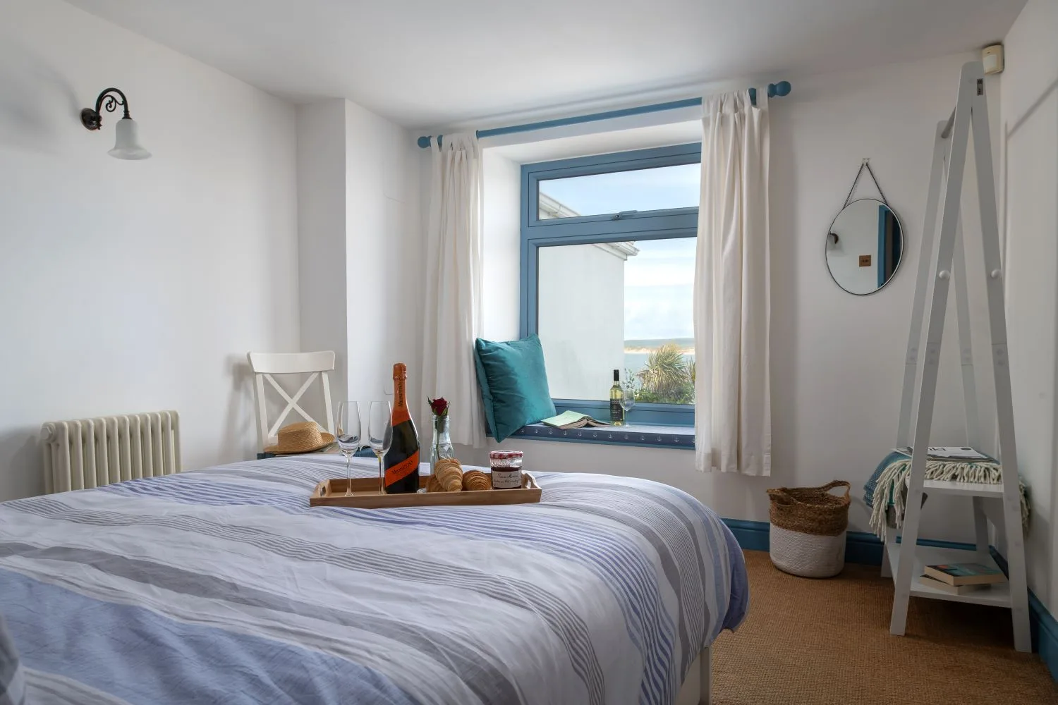 Bedroom 1 (first floor): Double bedroom with hanging rail for clothes, underbed storage drawers and window seat with coastal views.