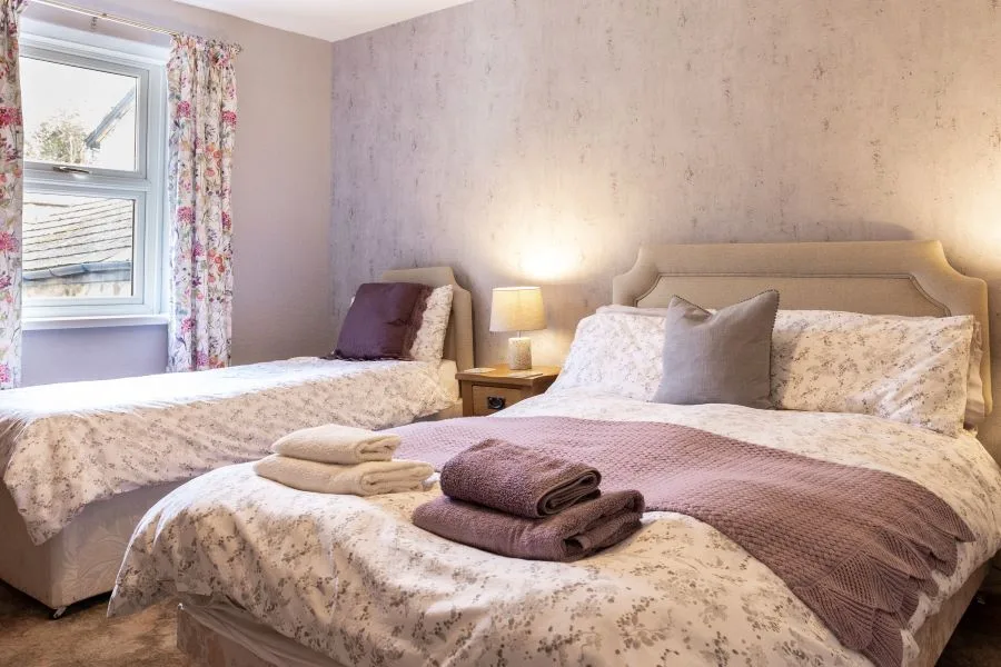 Bedroom 2 (First Floor): Large bedroom with one double bed and one single bed. Large wardrobe, chest of drawers and bedsides.