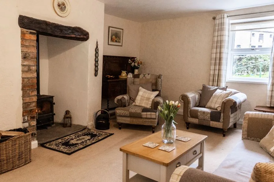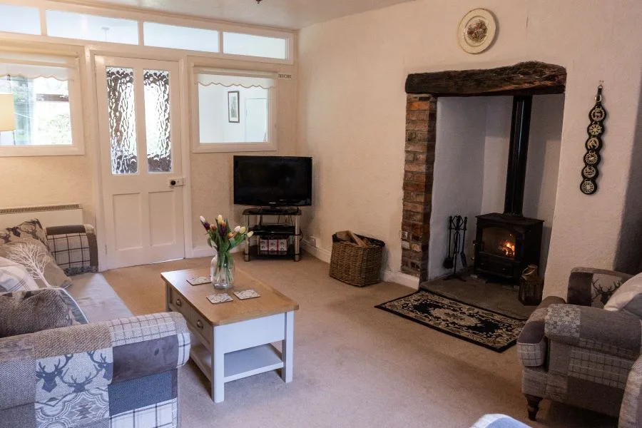 Living room: Soft comfortable sofa and two large fireside chairs. TV with Free Sat channels and DVD player. Wood burning stove.