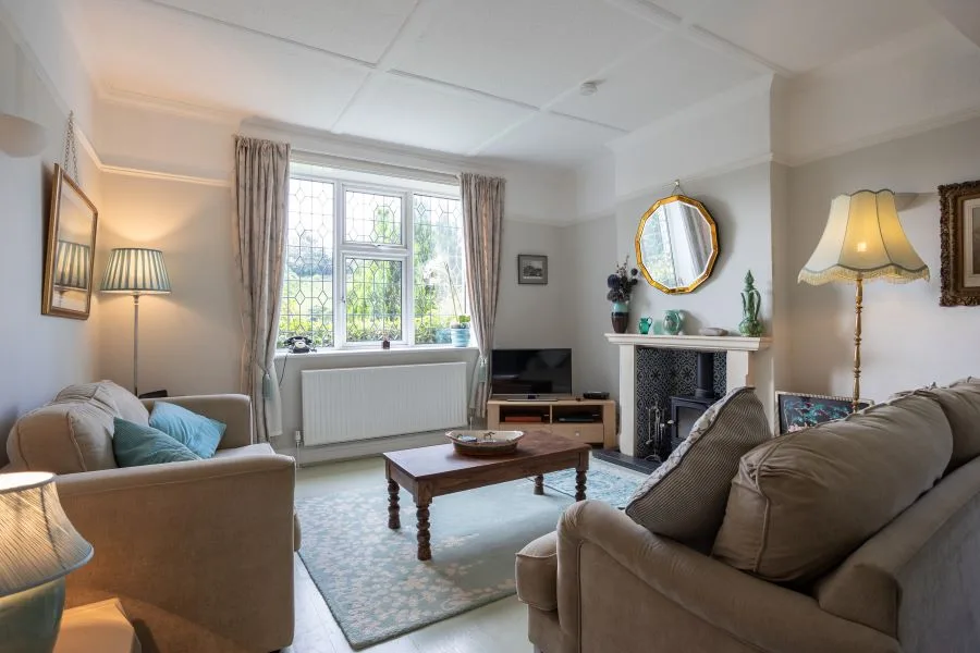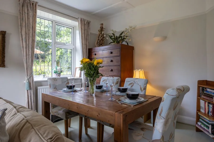 Living room: Bright and spacious room with 2 large comfortable sofas, Smart TV and wood burning stove. Dual aspect windows provide views overlooking the established garden and North Devon countryside. Dining area with dining table and 4 chairs that provides a lovely setting to enjoy an evening meal.
