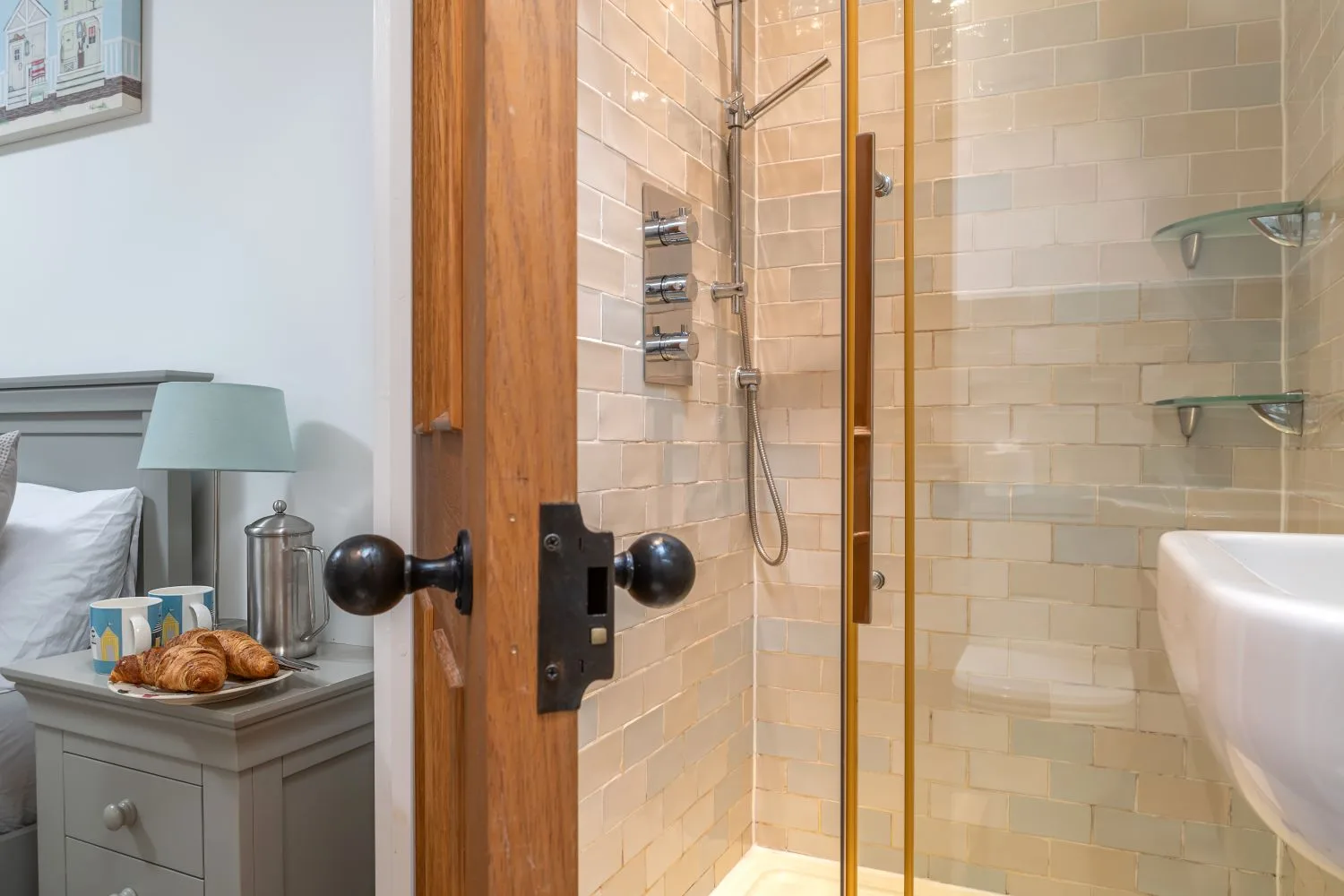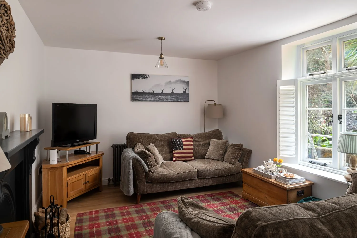 The bedrooms are arranged over the first and second floors. On the first floor, a spacious double bedroom enjoys lovely views over the river and benefits from a TV and en-suite facilities. Also on this floor is an attractive twin bedroom with TV, alongside a generous family shower room with a large walk-in shower. Steep stairs lead to the second floor, where a single bedroom with sloping, reduced height ceilings and views of the surrounding woodland creates a peaceful little hideaway.