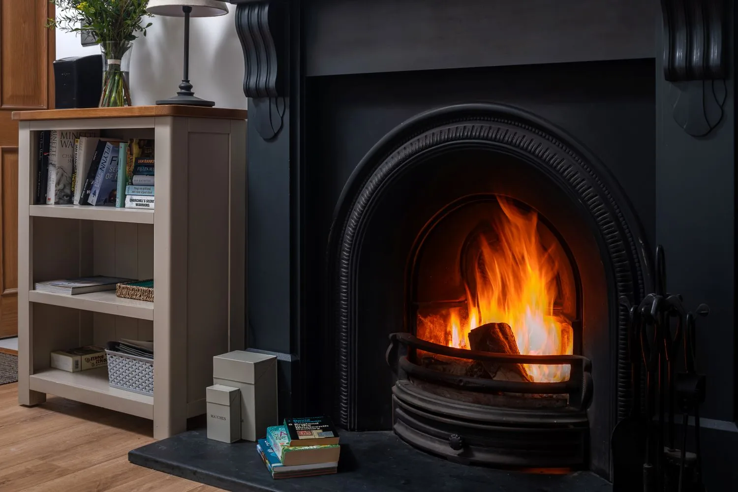 Living room: A cosy and welcoming space with comfortable seating and Smart TV, arranged around an open fire, perfect for unwinding after a day exploring Exmoor.