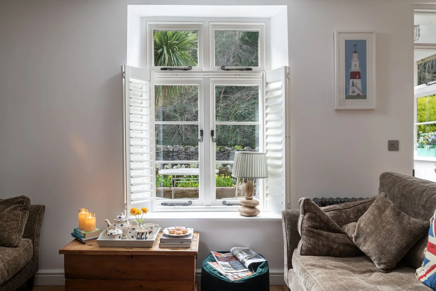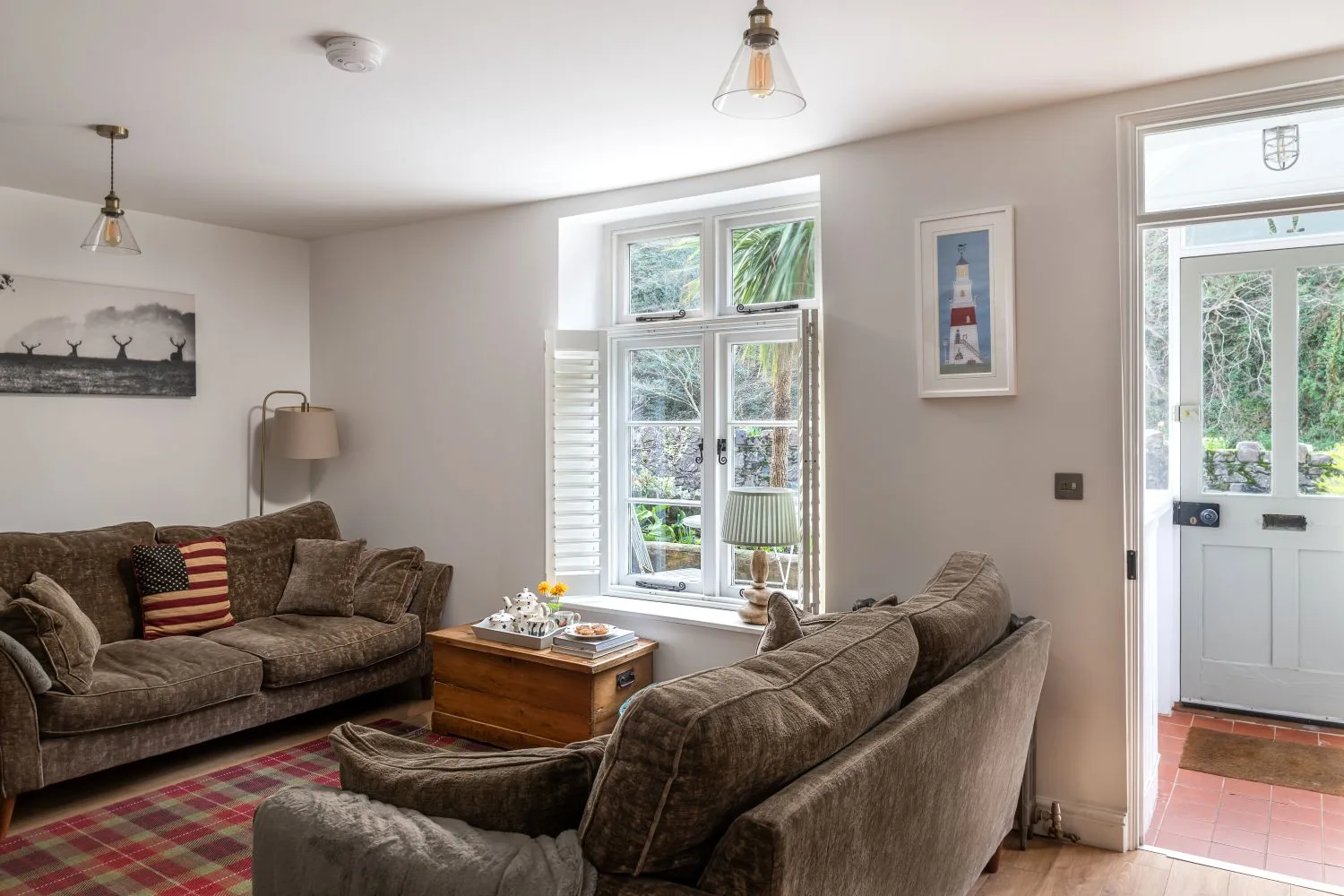 The cottage is thoughtfully furnished in a contemporary country style while retaining much of its original character. The cosy living room welcomes you with comfortable seating arranged around an open fire, making it a welcoming space to relax after a day exploring Lynmouth and the surrounding Exmoor countryside. To the rear, the stylish and well-equipped kitchen is a sociable space with a dining table seating five, ideal for leisurely breakfasts or evenings in. A door leads out to a small, enclosed courtyard, backing onto a dramatic rockface, and access to a useful utility area with washing machine and additional fridge/freezer, as well as space for rinsing muddy boots or paws after coastal or moorland walks. One of the most charming features of the cottage is the sunny courtyard at the front of the cottage, where you can immerse yourself in nature by listening to the gentle rush of the river.
