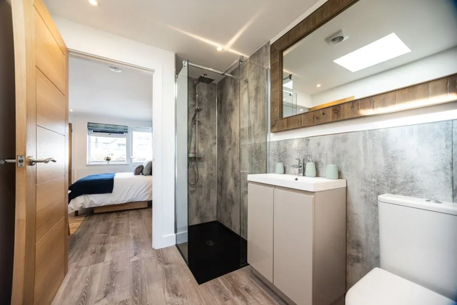 Downstairs bedroom with ensuite: King-size bed with bedsides, chest of drawers and wardrobe. Ensuite bathroom with walk-in rainfall shower, washbasin, WC & heated towel rail.
