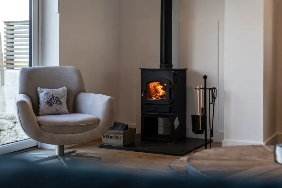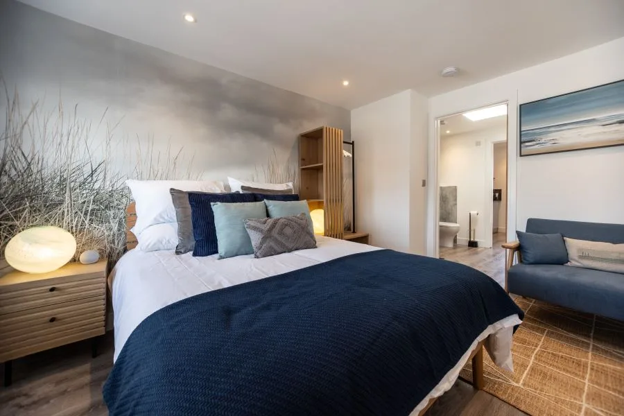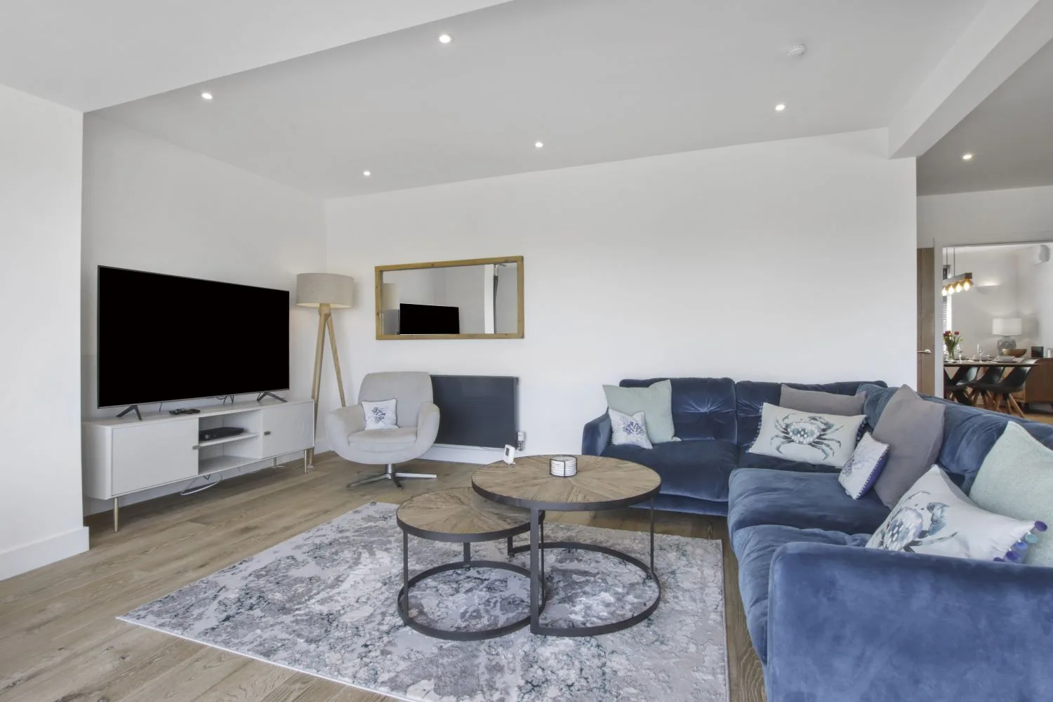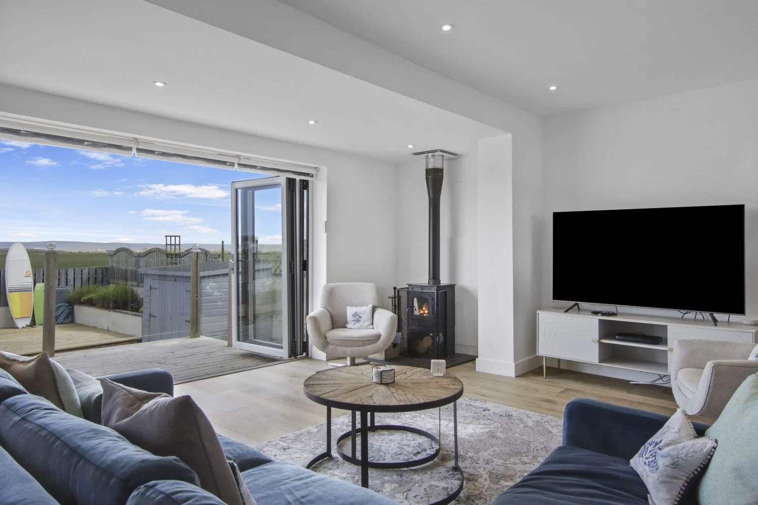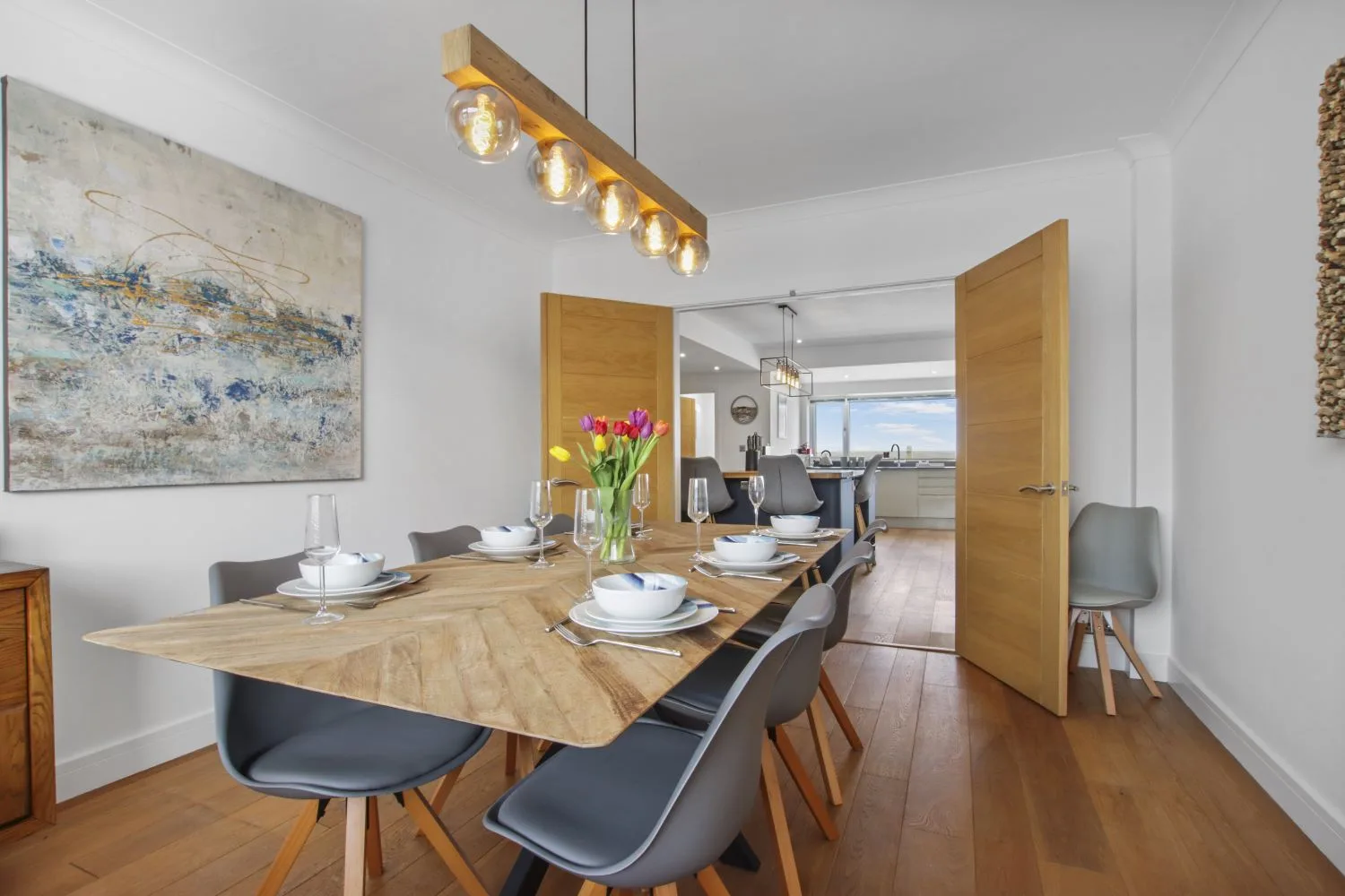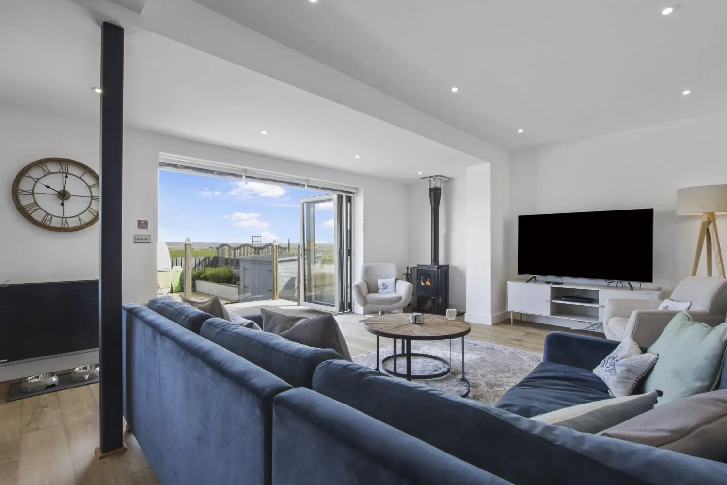 This airy and spacious property boasts 4 bedrooms, accommodating up to 8 guests. Upon entering, the hallway guides you to a King-size bedroom elegantly furnished with a wardrobe, chest of drawers, bedside tables, and an ensuite shower room. There is a delightful, cosy Annexe, which connects to the main house. There is a living/ sleeping area with a luxurious king size bed, wardrobe/storage unit, compact two seater sofa, dining table with chairs and Smart TV. There is a modern bathroom, with walk in shower and rainfall shower head. There is also a well equipped kitchen and private patio with the Annexe. The ground floor bedrooms and bathrooms make this property ideal for multi-generational families. The main house has a bright, open-plan living room and kitchen, which serve as the home’s centrepiece, offering ample comfortable seating, a breakfast bar, a large Smart TV, and a wood-burning stove. The modern, well-equipped kitchen features a fridge/freezer, double electric ovens, an induction hob, a wine cooler, a dishwasher, and a microwave – perfect for preparing meals to savour on the decked terrace while soaking in the breathtaking coastal scenery. For larger family meals, the dining room accommodates 8 guests.