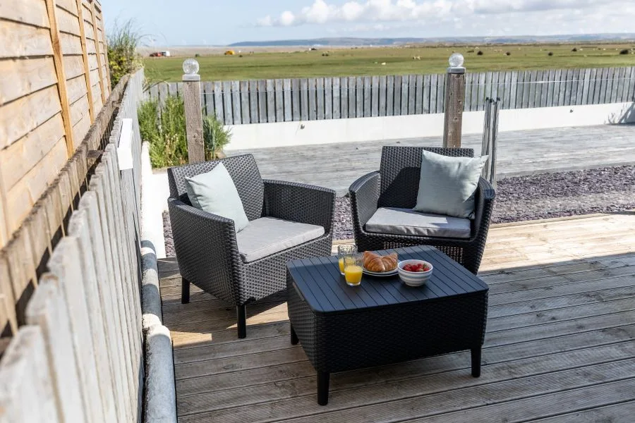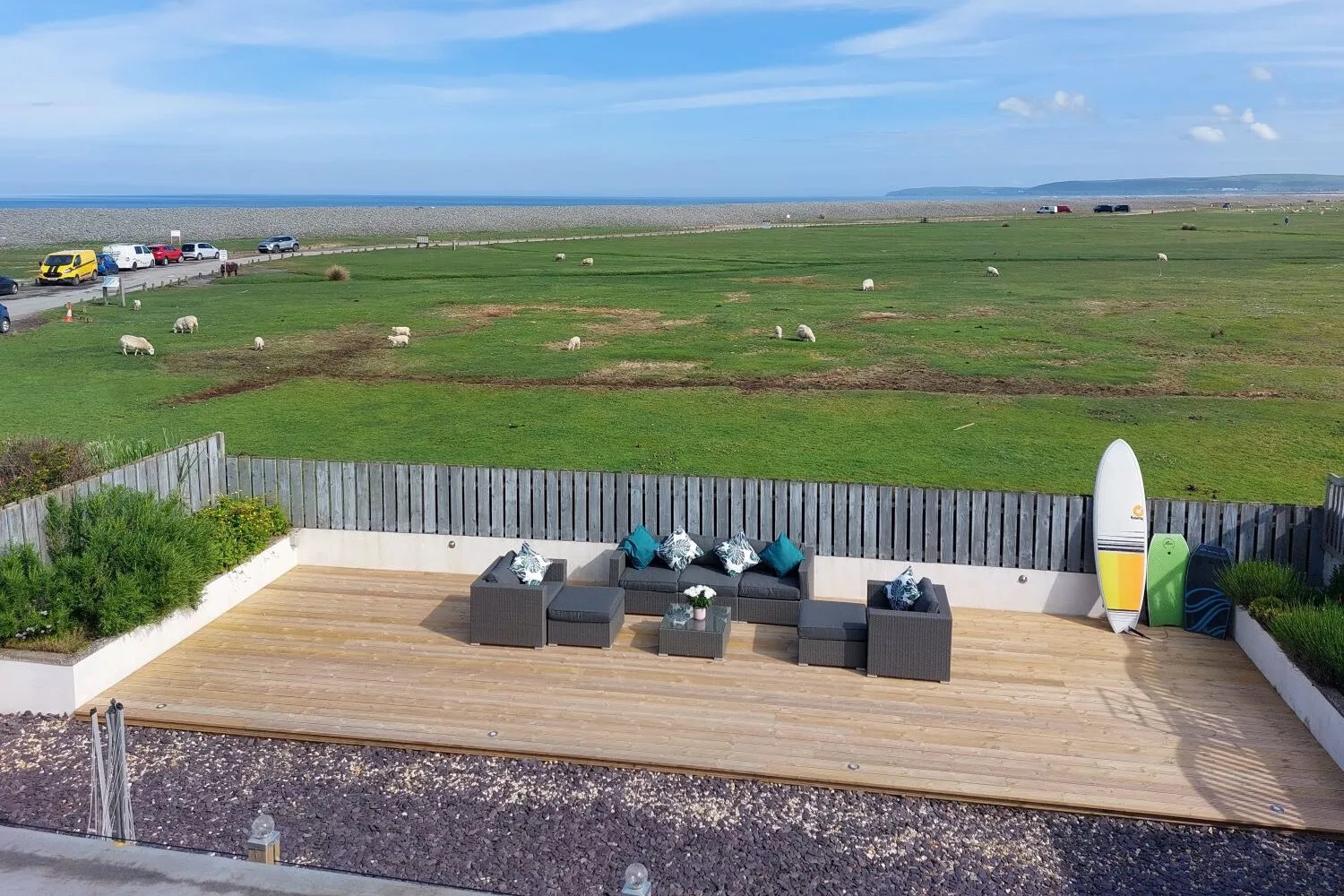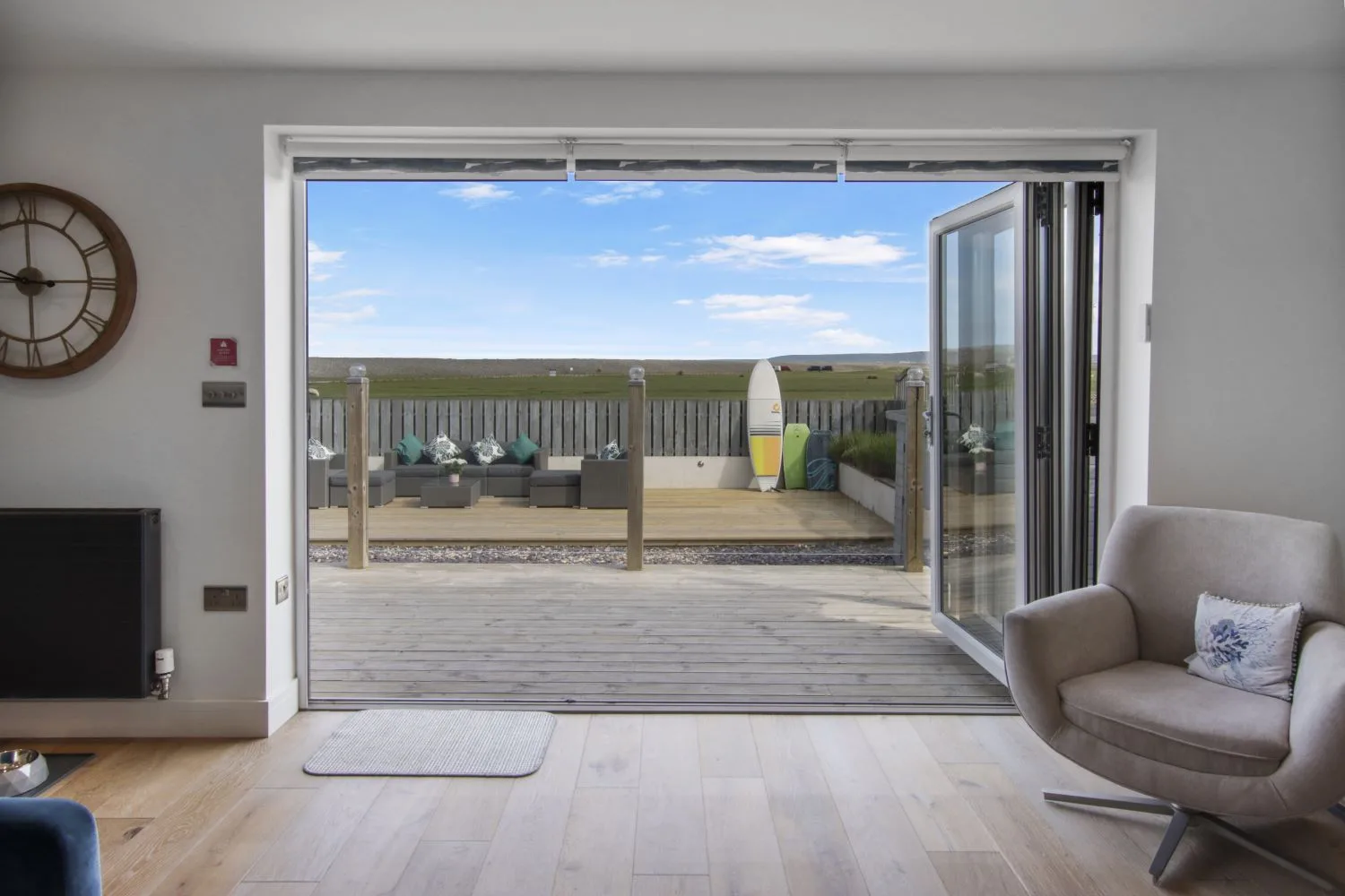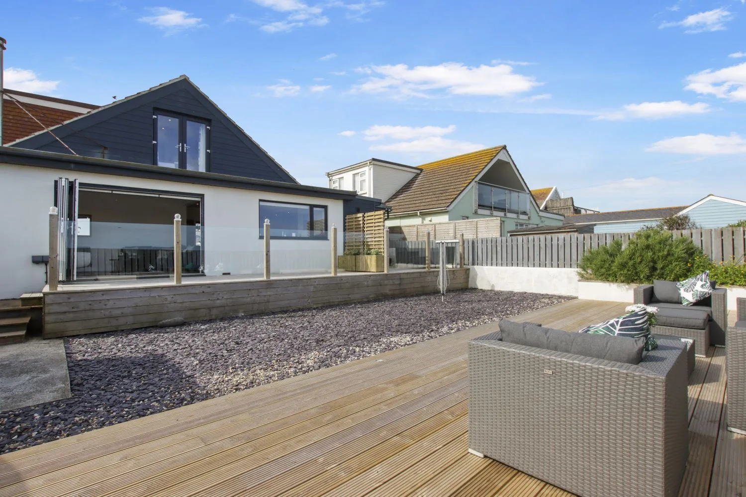 Garden: Decked patio off kitchen/living area with garden furniture, providing impressive views over the Northam Burrows Country Park Nature Reserve.