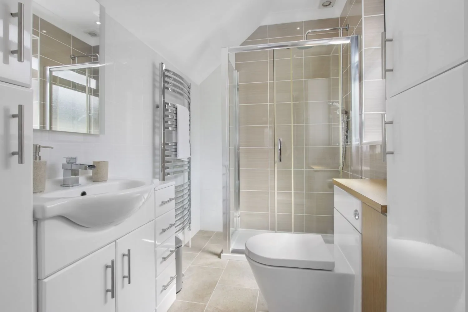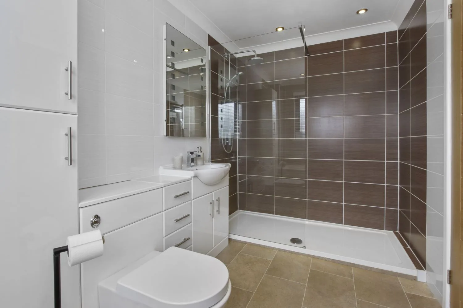 Bathroom: Walk in shower with rainfall showerhead, bath, wash basin, WC and heated towel rail.