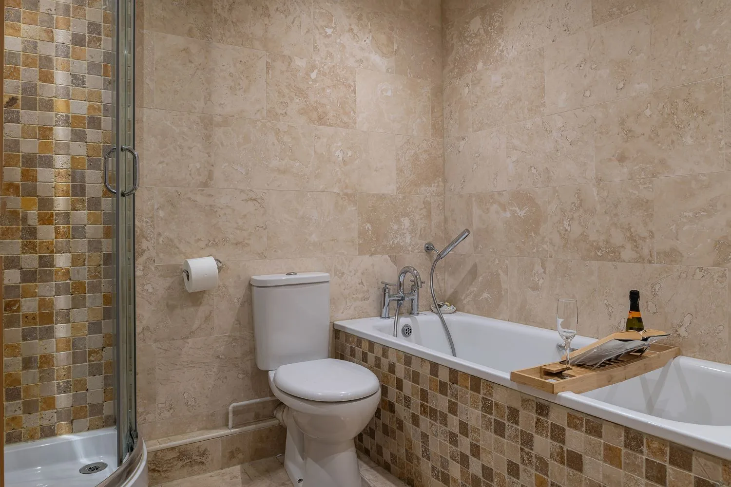 Bathroom: Bath with shower cubicle, wash basin, WC and heated towel rail.