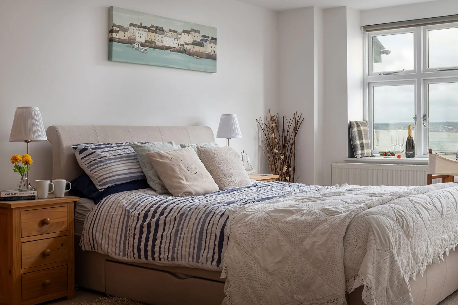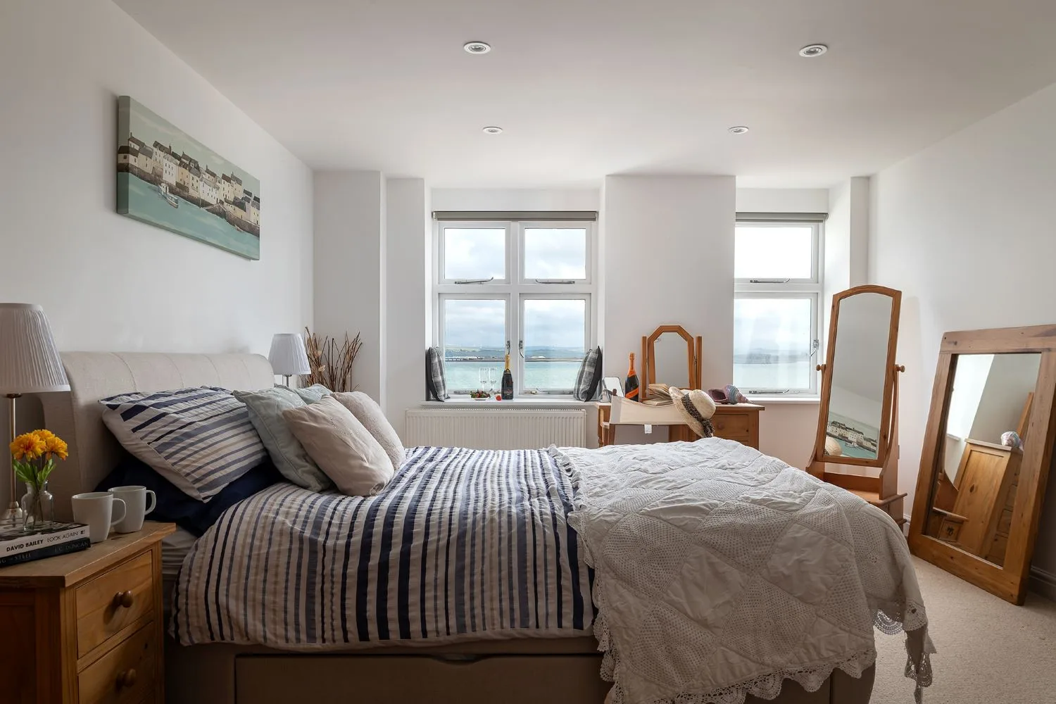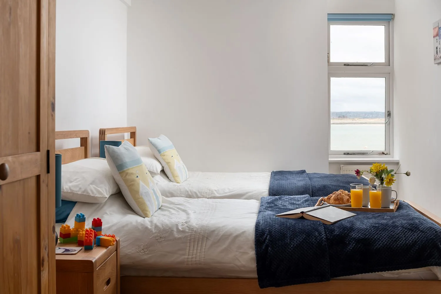 Bedroom 2: Twin bedroom with wardrobe, bedsides and coastal views.