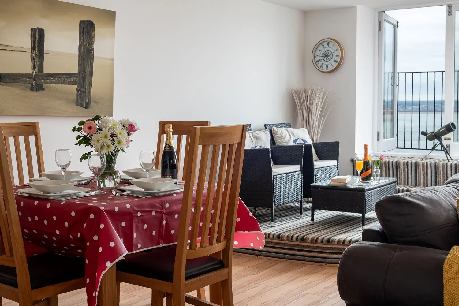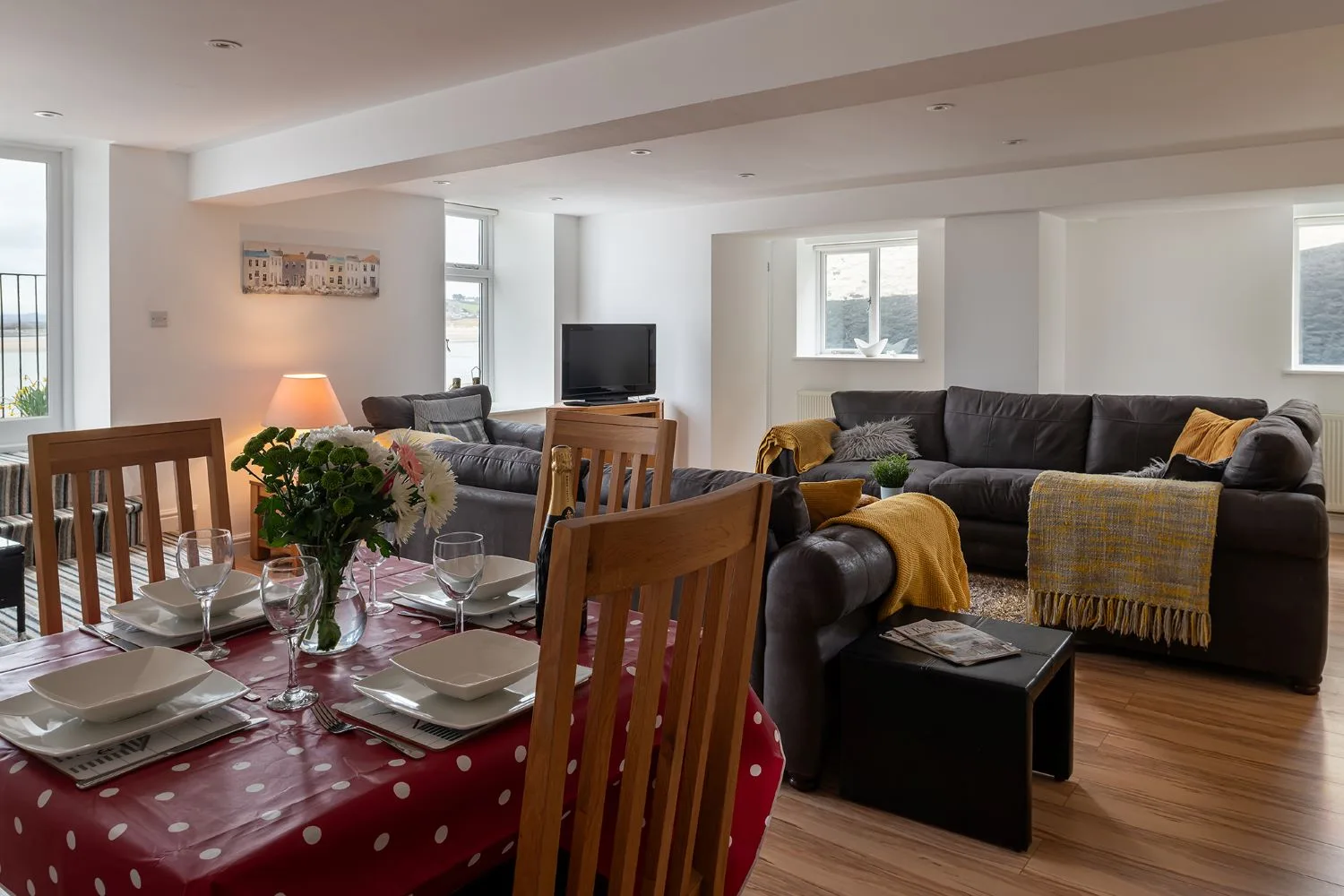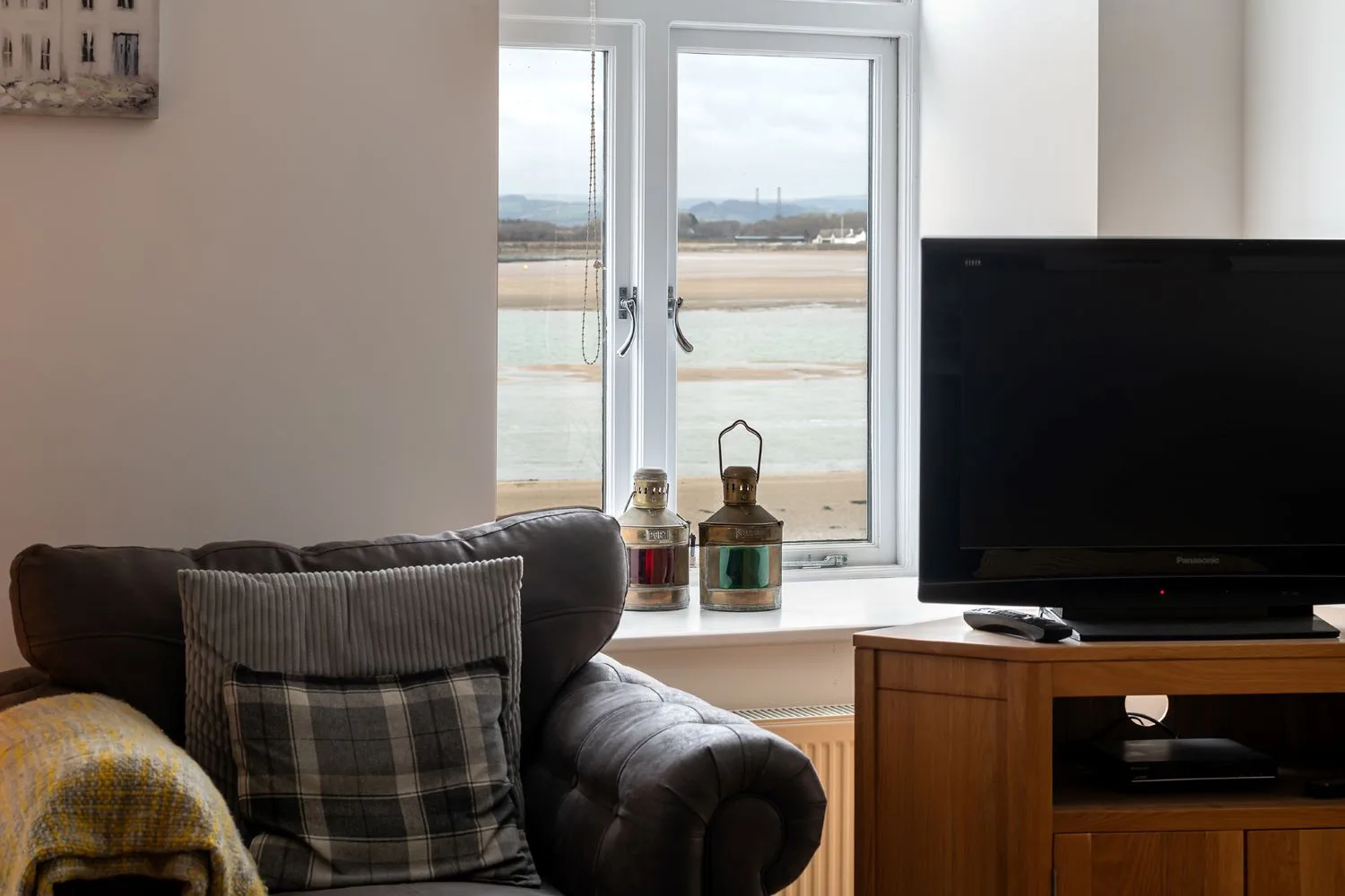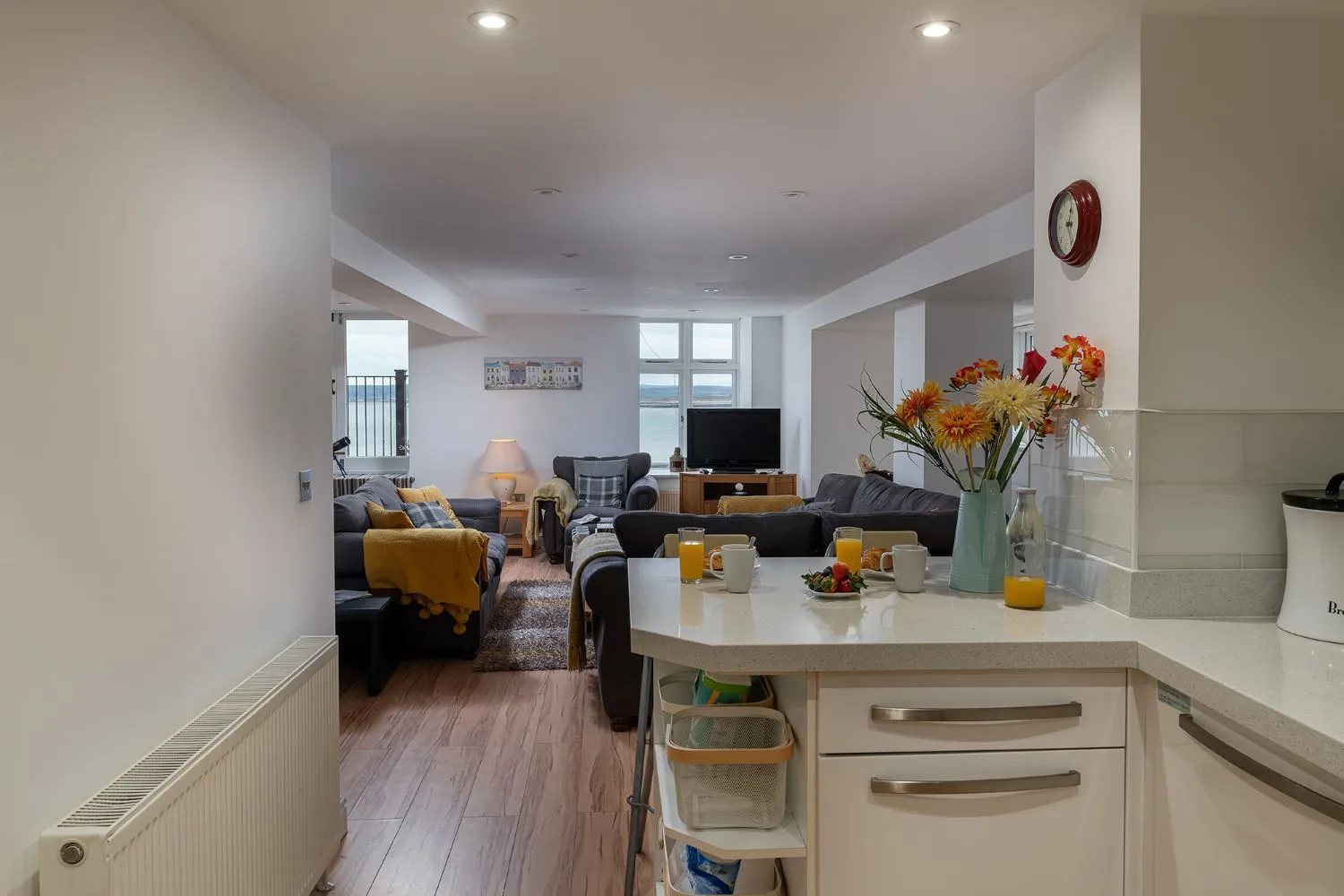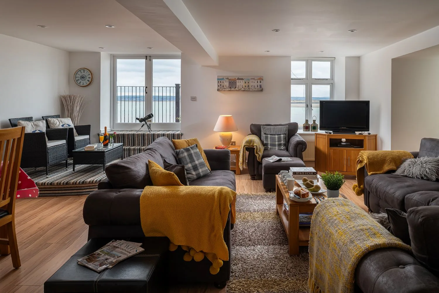 Living room: A bright spacious living room with soft comfortable sofas and large Smart TV, Patio doors leading to a balcony with far reaching estuary views.