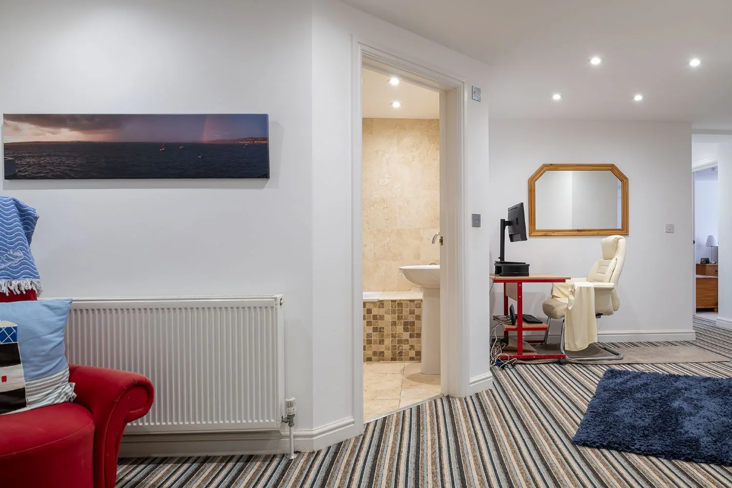Bedroom 1: Spacious king size bedroom with wardrobe, dressing table, bedsides, TV and coastal views from the windows. En-suite bathroom with shower cubicle, heated towel rail, WC and wash basin.