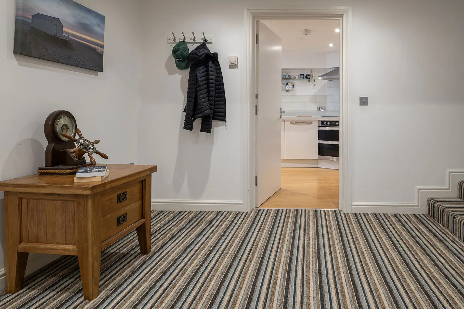 Entrance: 13 Steps lead down to the hallway from front door. This leads to a large hallway with workstation area.