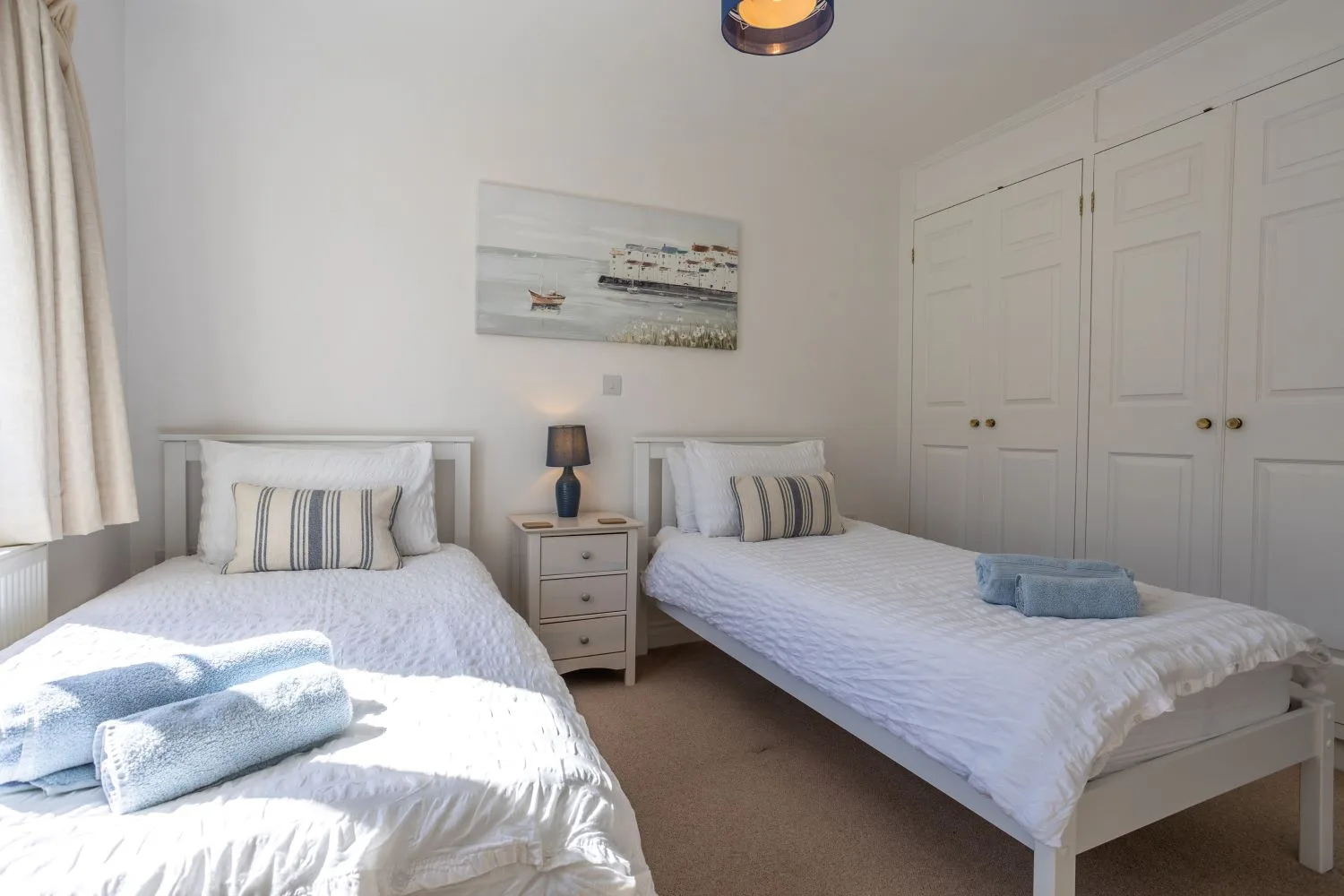 Bedroom 1 (Ground Floor): Twin beds with built in wardrobe, bedside cabinet and ensuite shower room, with shower cubicle, wash basin and towel rail.