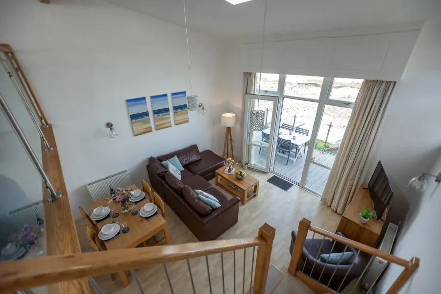 As you step inside, you’ll be greeted by an inviting open-plan living room and kitchen, bathed in natural light and offering breathtaking sea vistas through full-length windows. The living room is furnished with comfortable sofas, a large Smart TV, a vaulted ceiling, and patio doors that frame Westward Ho! beach. The well-appointed kitchen is equipped with everything you need to prepare a delightful meal, whether you choose to dine indoors or al fresco on the balcony. On the ground floor, you’ll discover a twin bedroom with an en-suite shower cubicle. Ascending to the first floor, a mezzanine area serves as the perfect ‘chill out’ space, featuring cosy seating, another Smart TV, and captivating views of Westward Ho! beach. Continuing from here, you’ll find the family bathroom and the master bedroom, complete with a king-size bed, built-in wardrobes, and a dressing area. One of the standout features of this property is the expansive decked balcony. Here, you’re practically at the water’s edge, providing the ideal vantage point for observing the skills of surfers during the day and relishing spectacular sunsets in the evening.