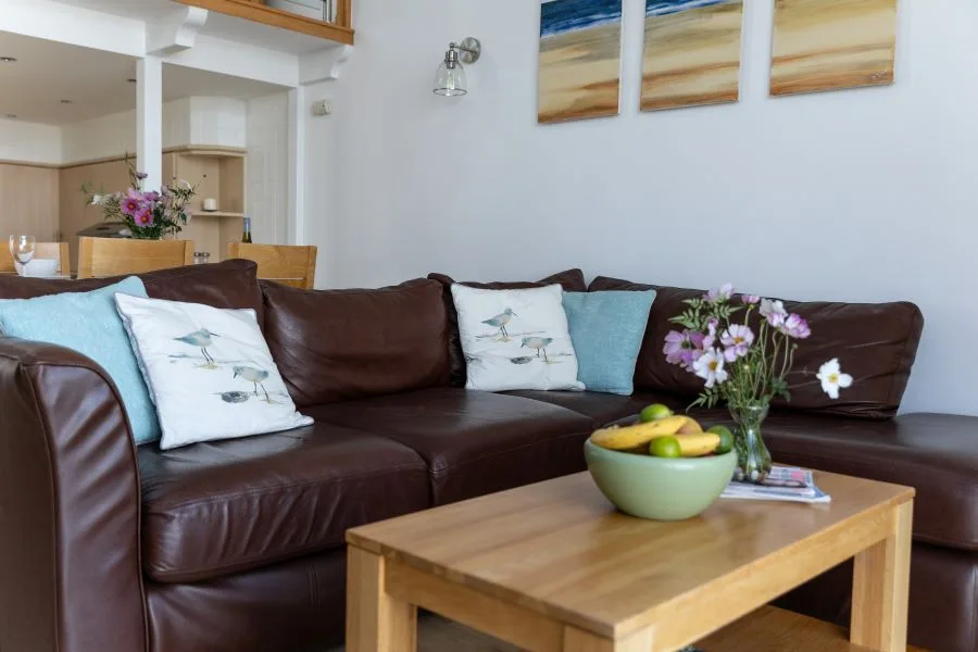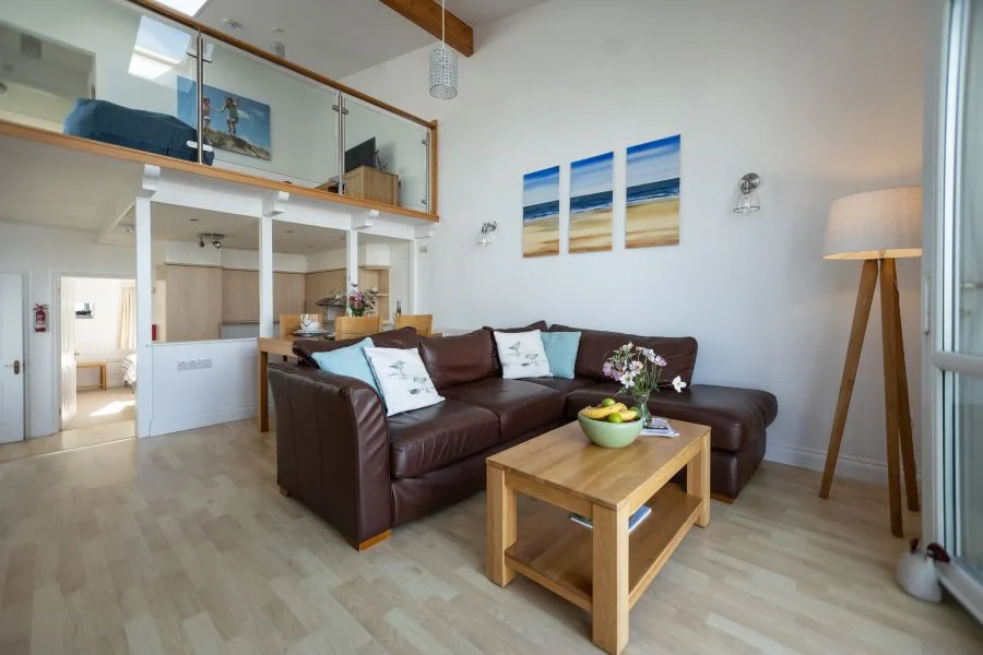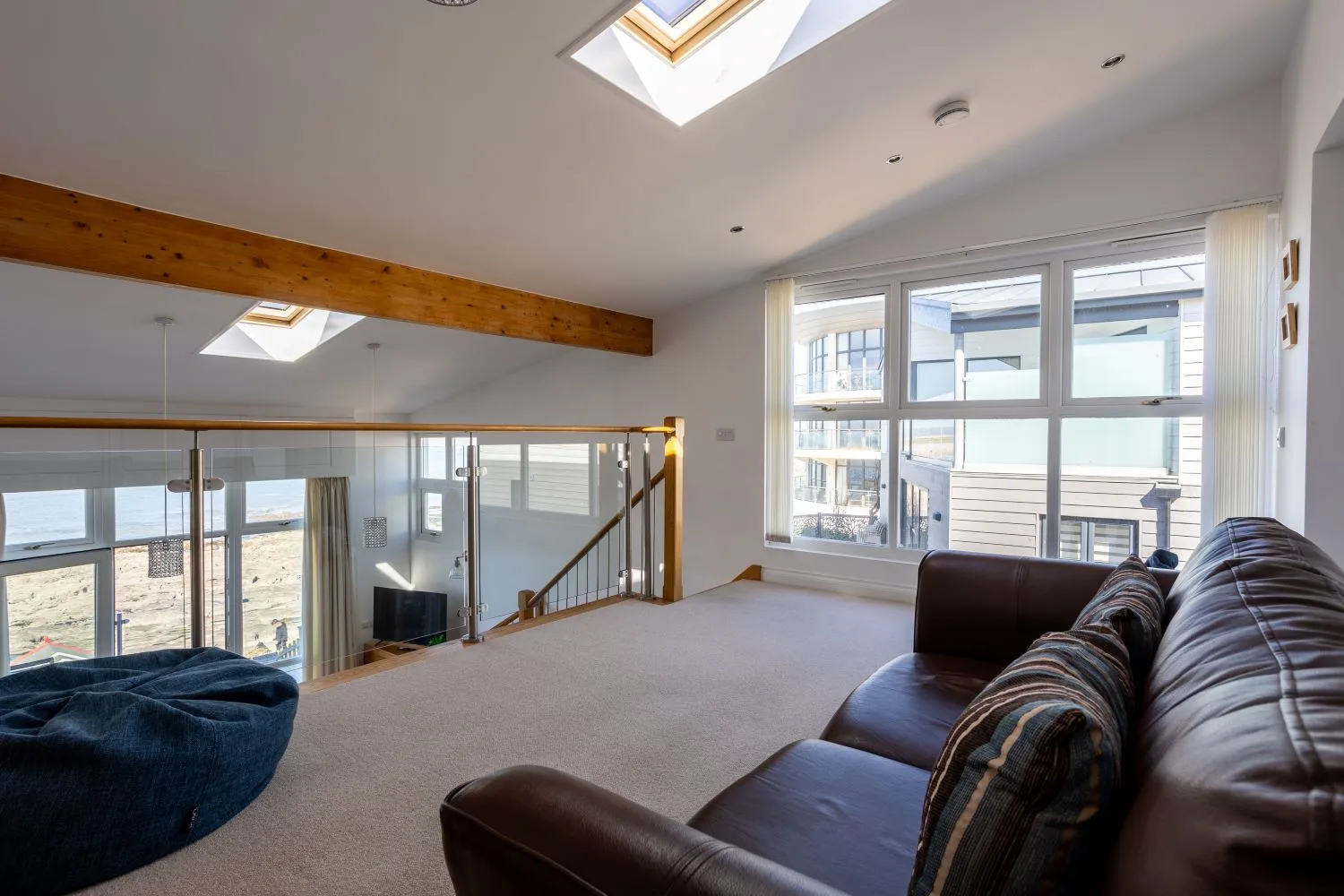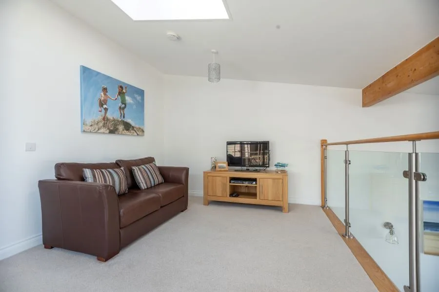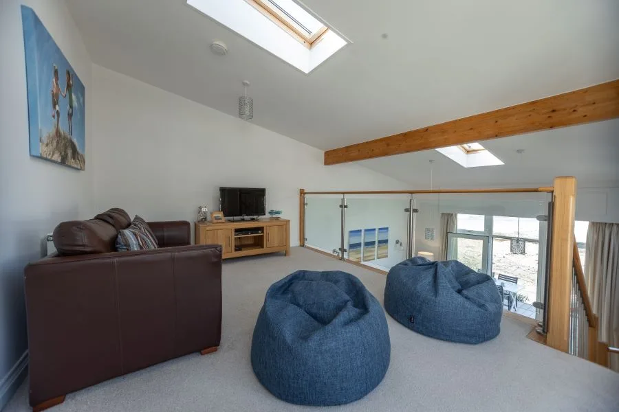 Seating Area (First Floor): Mezzanine seating area with sofa, two bean bags, Smart TV, DVD player, selection of DVD’s and sea views.