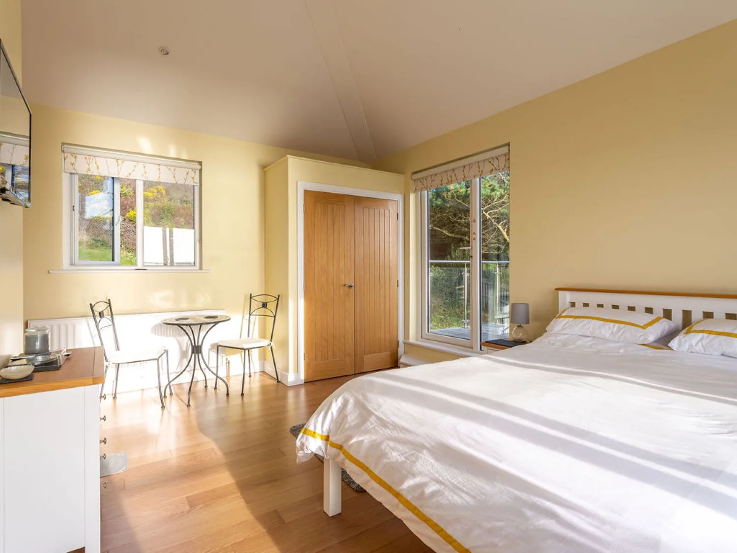 Bedroom 1 (Ground Floor): Kingsize room with Smart TV, wardrobe, chest of drawers and wash basin.