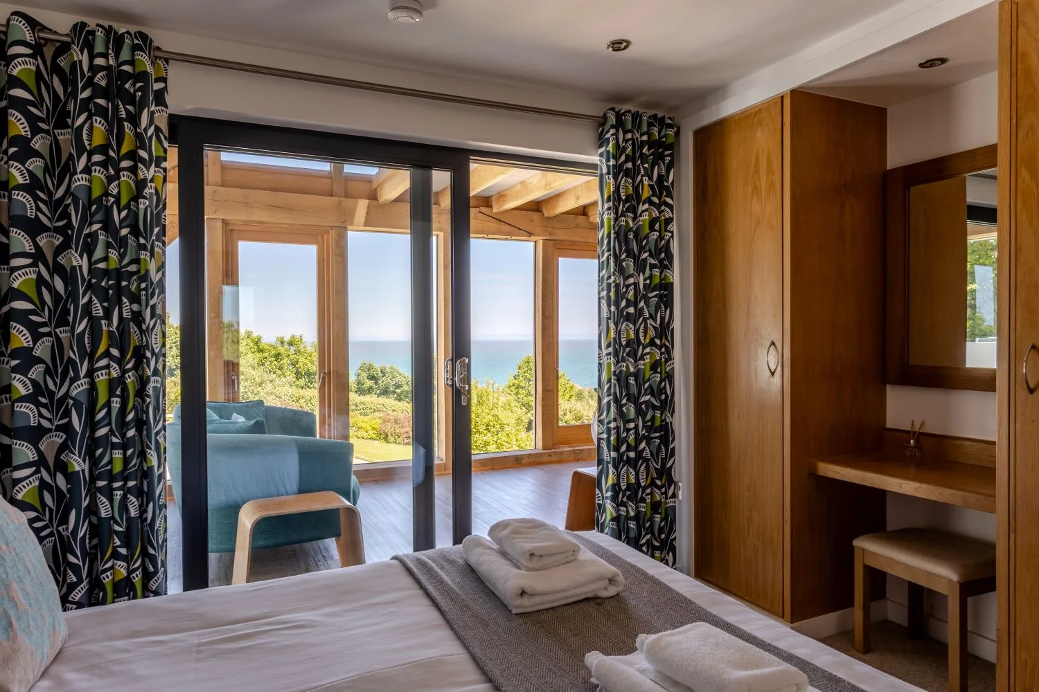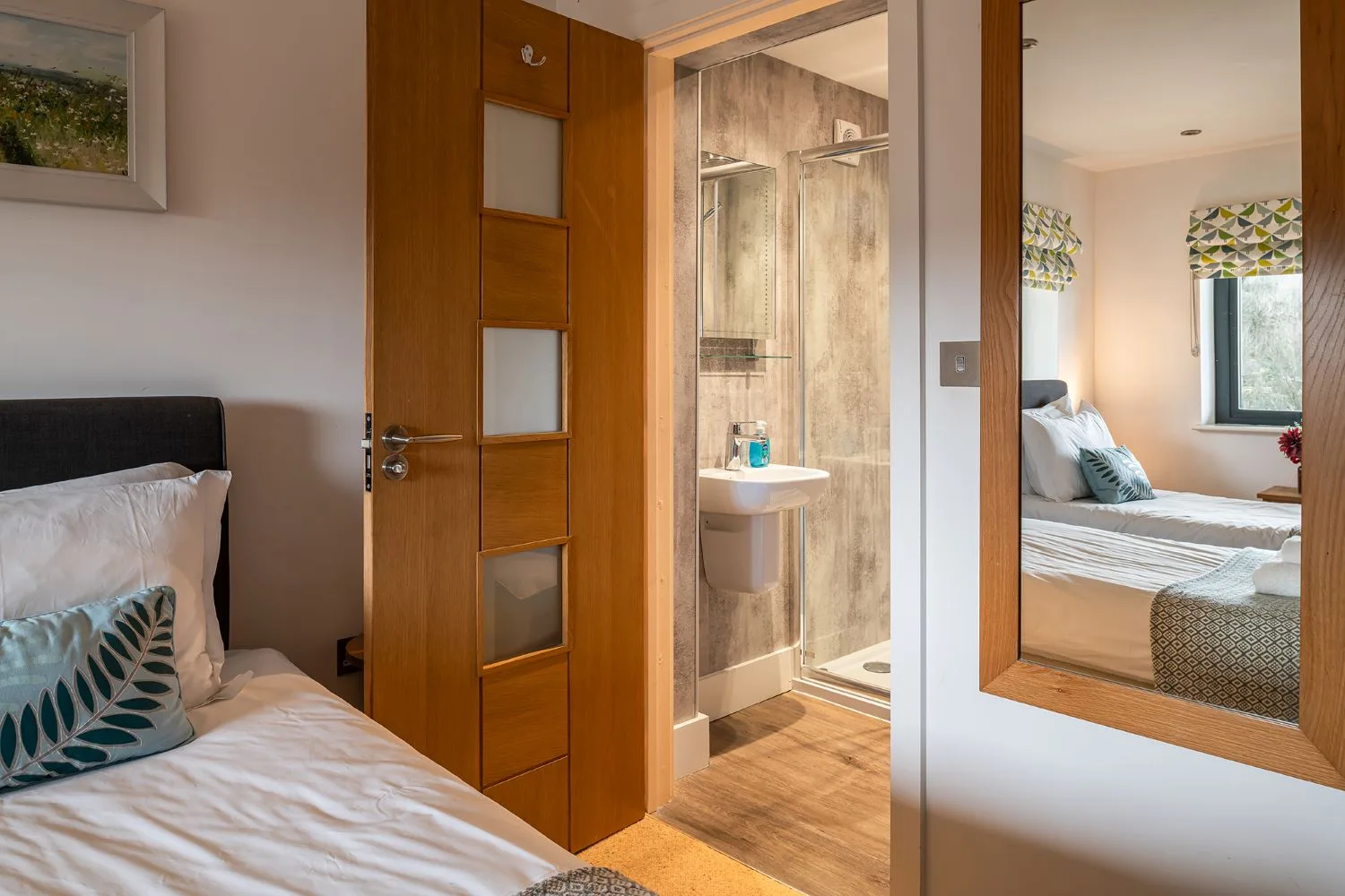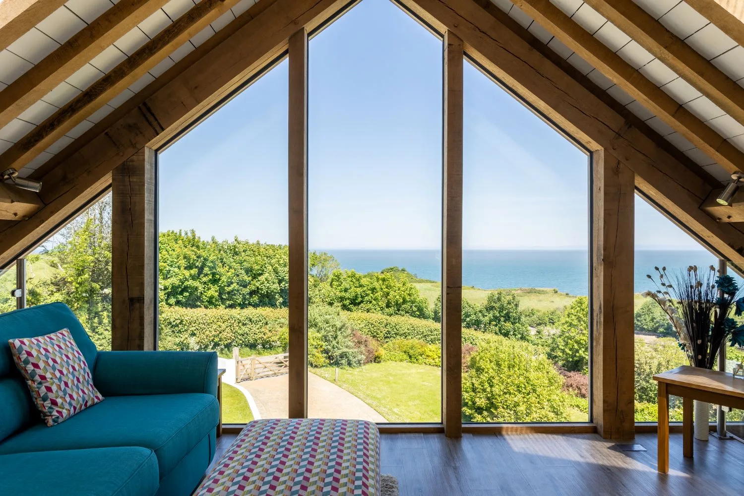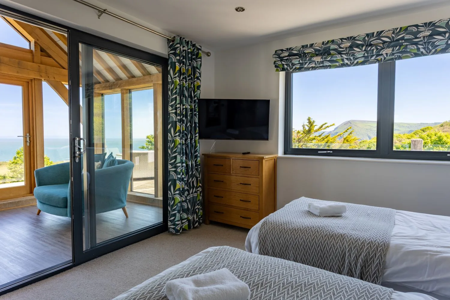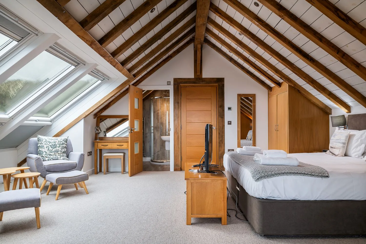 The top floor is home to the stunning master bedroom, featuring a luxurious super king-size bed. This elegant retreat boasts characterful exposed wooden ceiling beams and a series of sloping Velux windows that flood the space with natural light. The en-suite shower room adds to the convenience, while a floor-to-ceiling patio door leads out to a private upper viewing gallery. Complete with a cosy sofa, this serene spot offers breathtaking views of the rolling countryside and coastline beyond. Also on this level is a beautifully designed twin bedroom, which can be converted into a super king via a zip-and-link option. This room also benefits from its own en-suite shower room, ensuring comfort and privacy for all guests.
