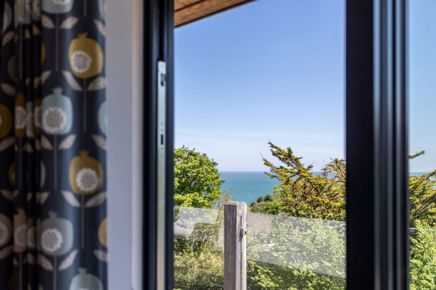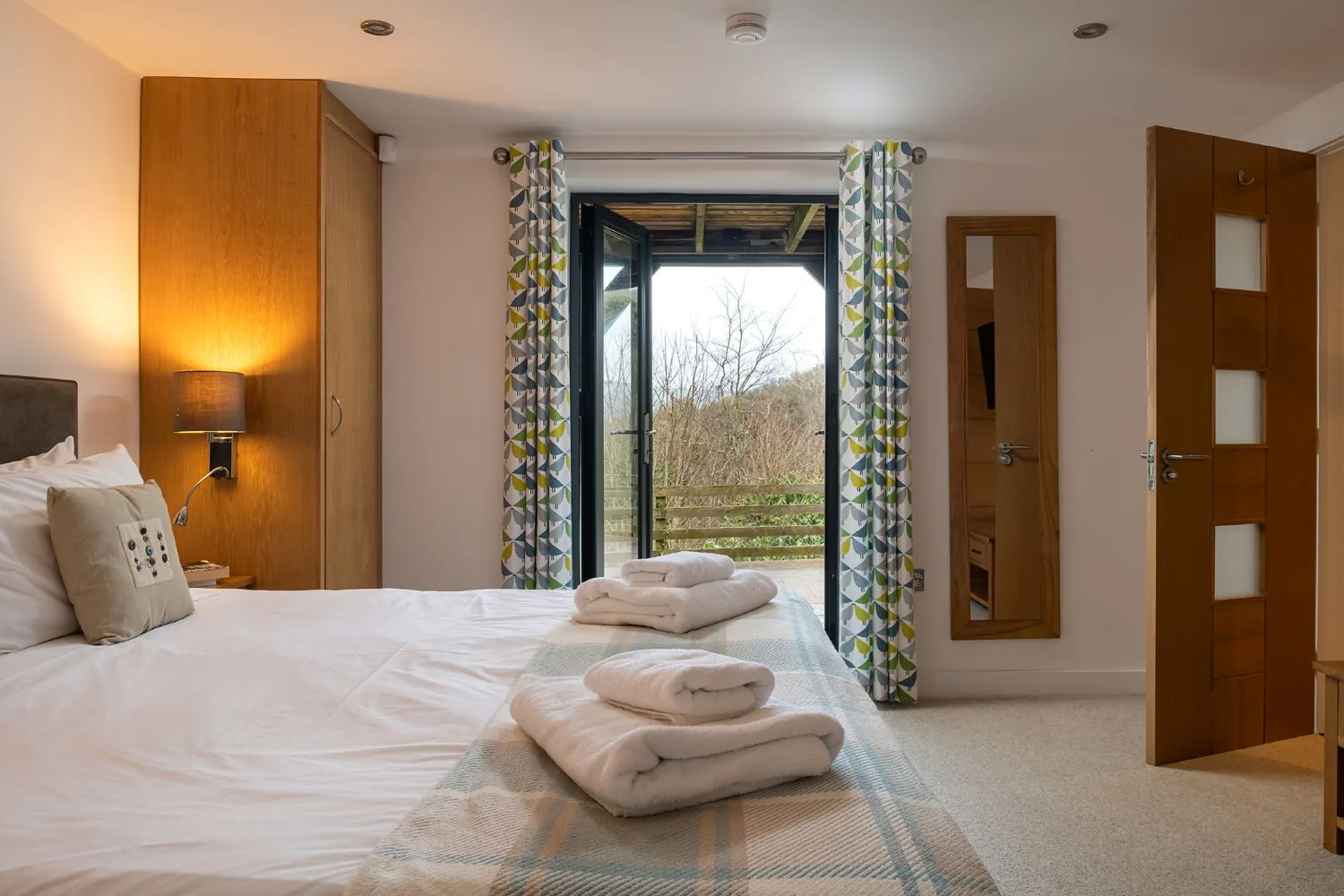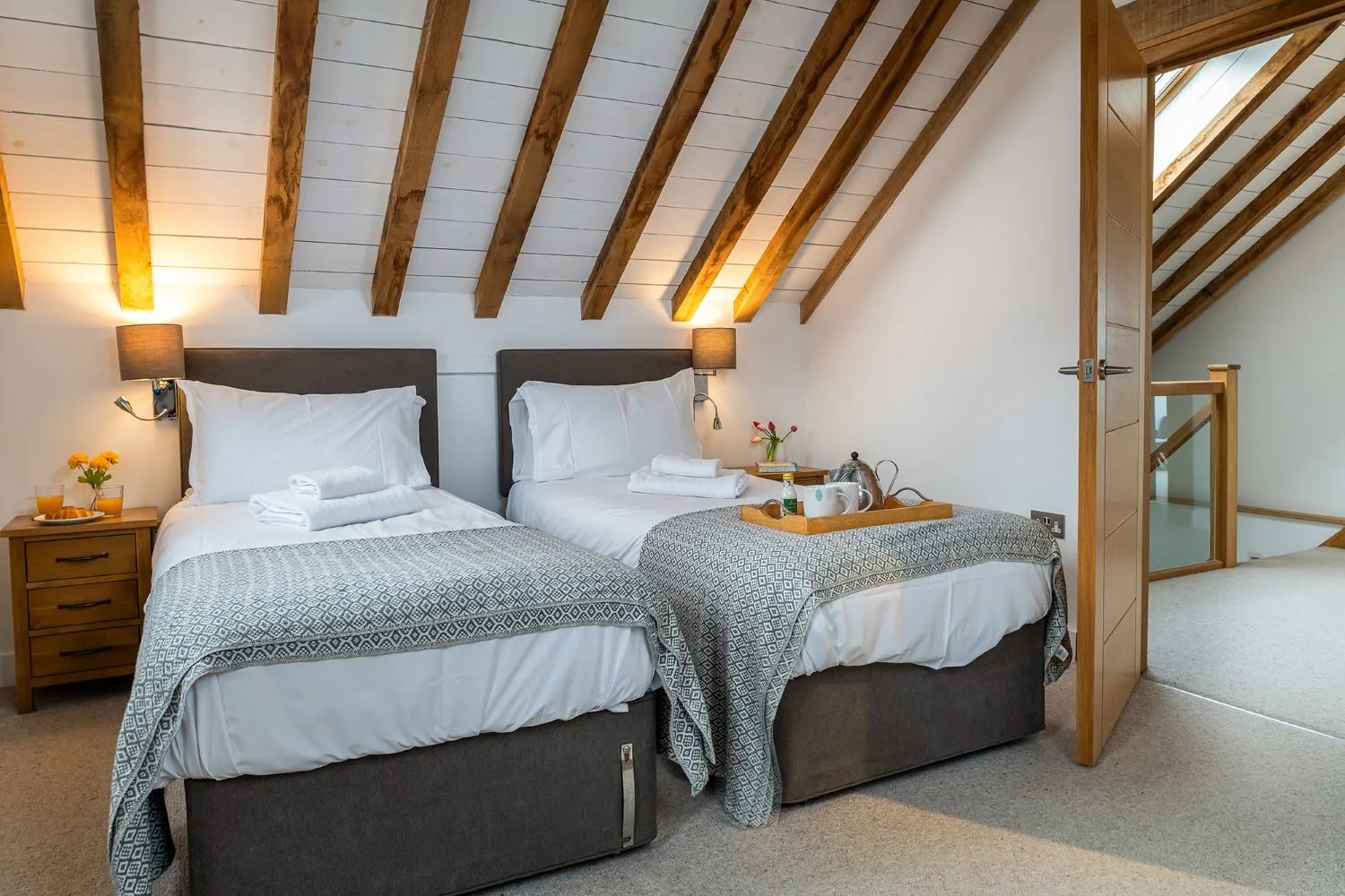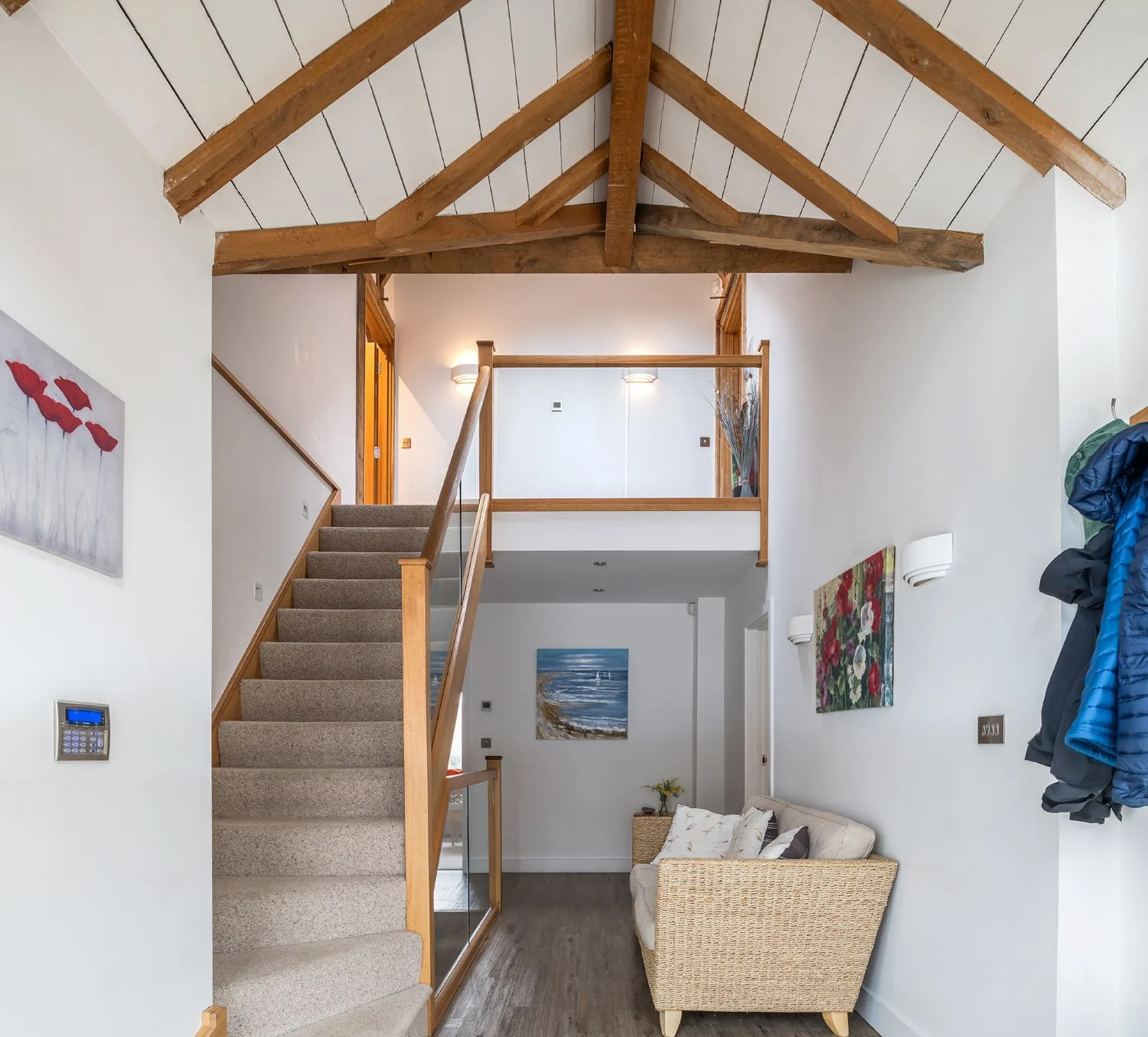 The top floor is home to the stunning master bedroom, featuring a luxurious super king-size bed. This elegant retreat boasts characterful exposed wooden ceiling beams and a series of sloping Velux windows that flood the space with natural light. The en-suite shower room adds to the convenience, while a floor-to-ceiling patio door leads out to a private upper viewing gallery. Complete with a cosy sofa, this serene spot offers breathtaking views of the rolling countryside and coastline beyond. Also on this level is a beautifully designed twin bedroom, which can be converted into a super king via a zip-and-link option. This room also benefits from its own en-suite shower room, ensuring comfort and privacy for all guests.