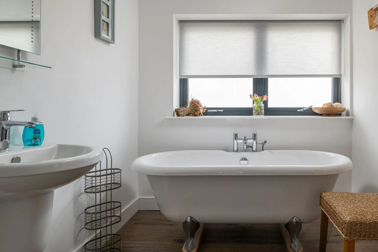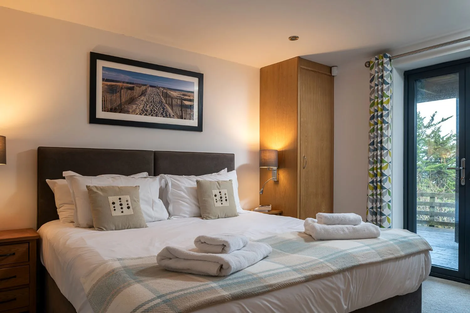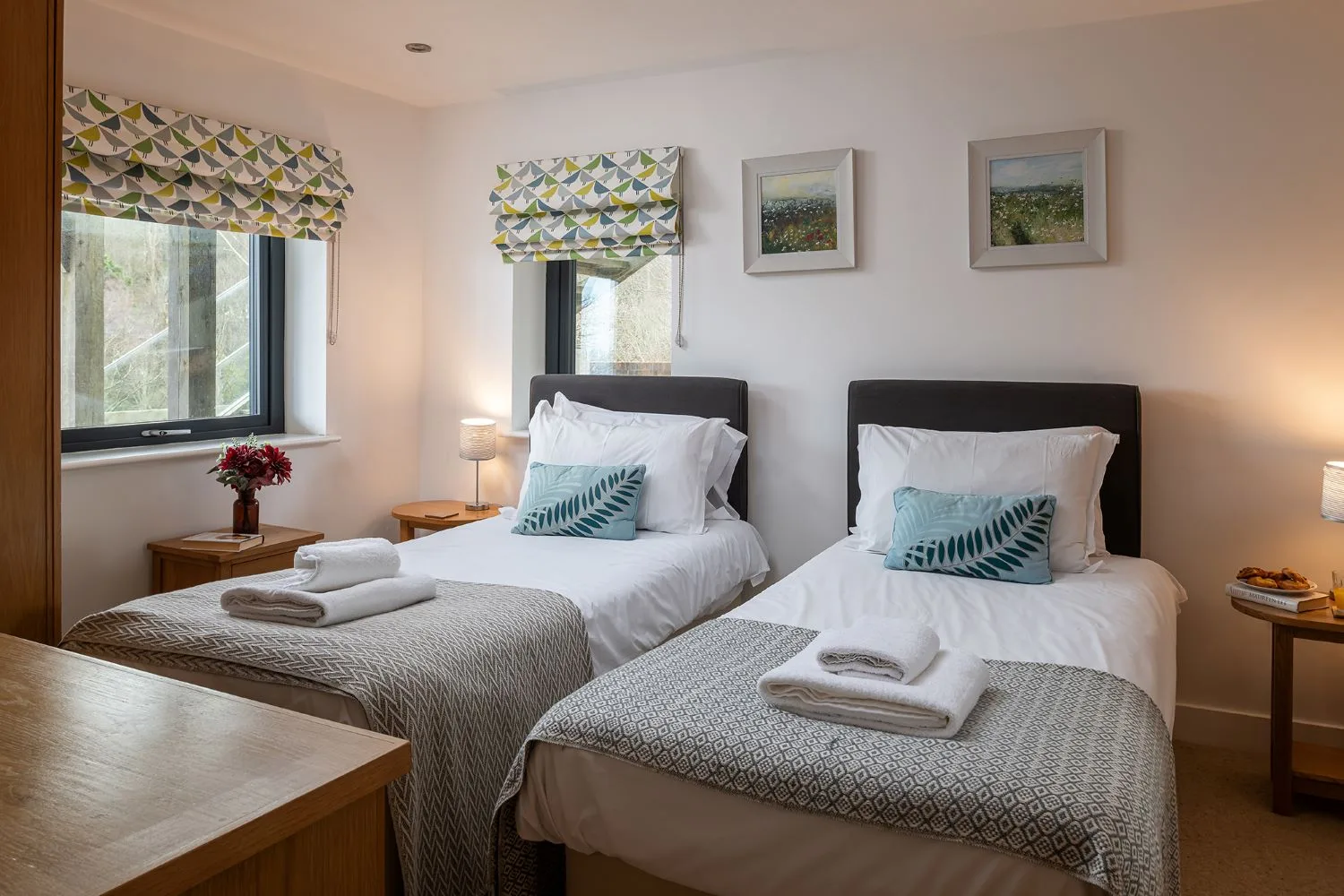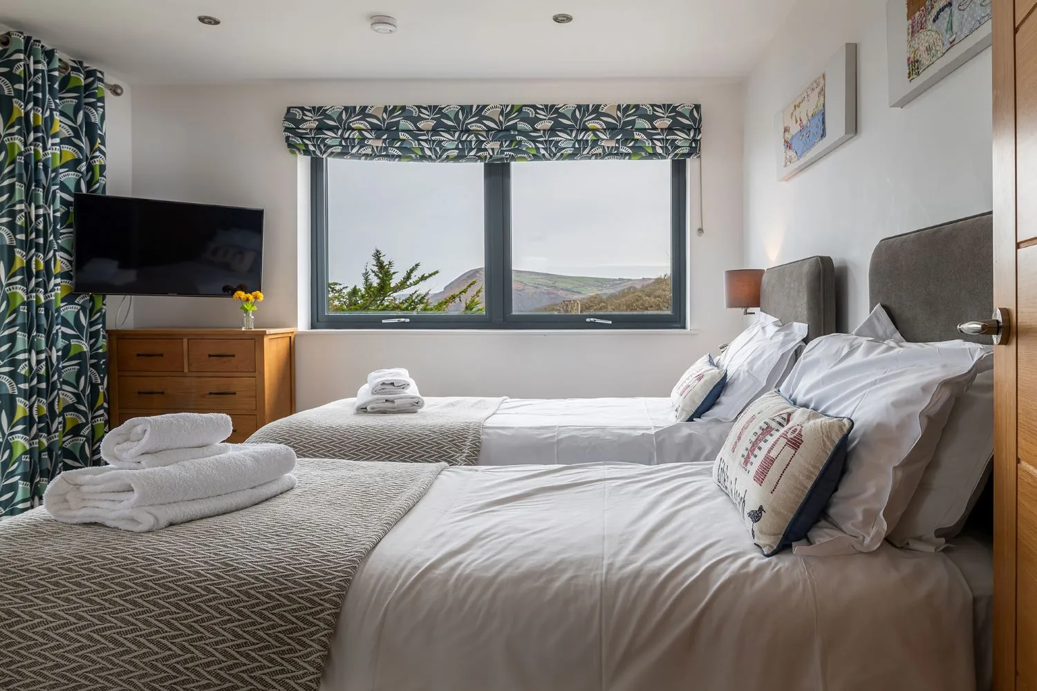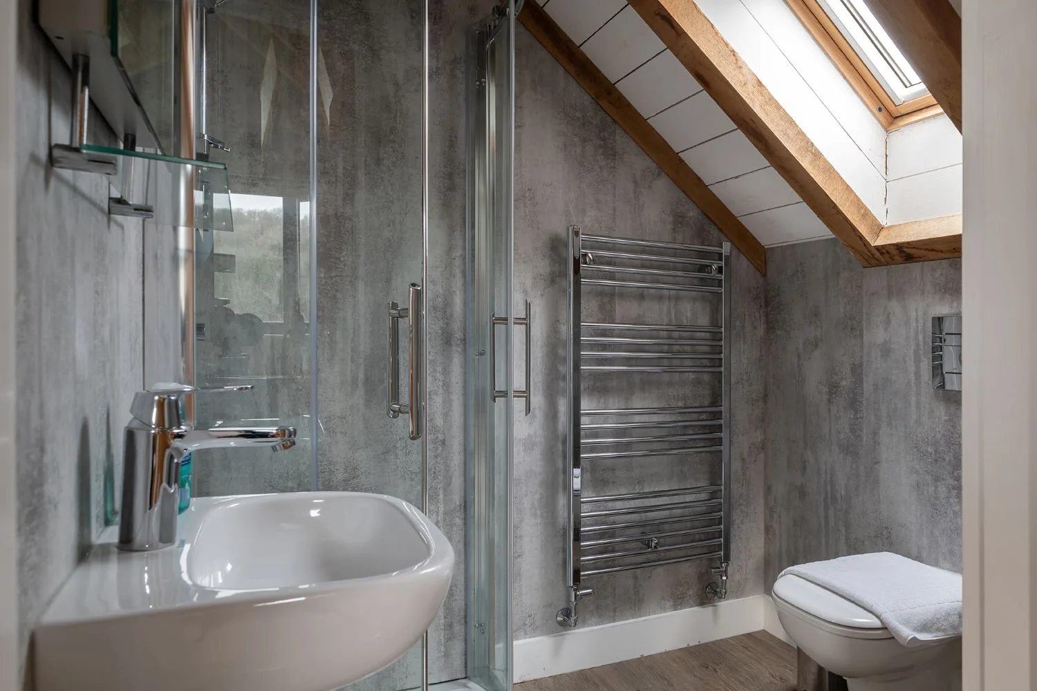 The top floor is home to the stunning master bedroom, featuring a luxurious super king-size bed. This elegant retreat boasts characterful exposed wooden ceiling beams and a series of sloping Velux windows that flood the space with natural light. The en-suite shower room adds to the convenience, while a floor-to-ceiling patio door leads out to a private upper viewing gallery. Complete with a cosy sofa, this serene spot offers breathtaking views of the rolling countryside and coastline beyond. Also on this level is a beautifully designed twin bedroom, which can be converted into a super king via a zip-and-link option. This room also benefits from its own en-suite shower room, ensuring comfort and privacy for all guests.