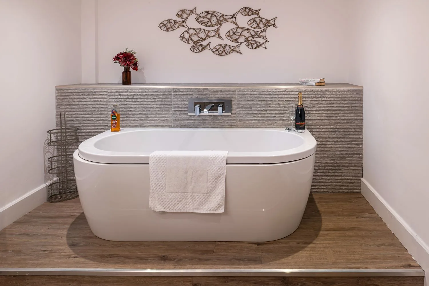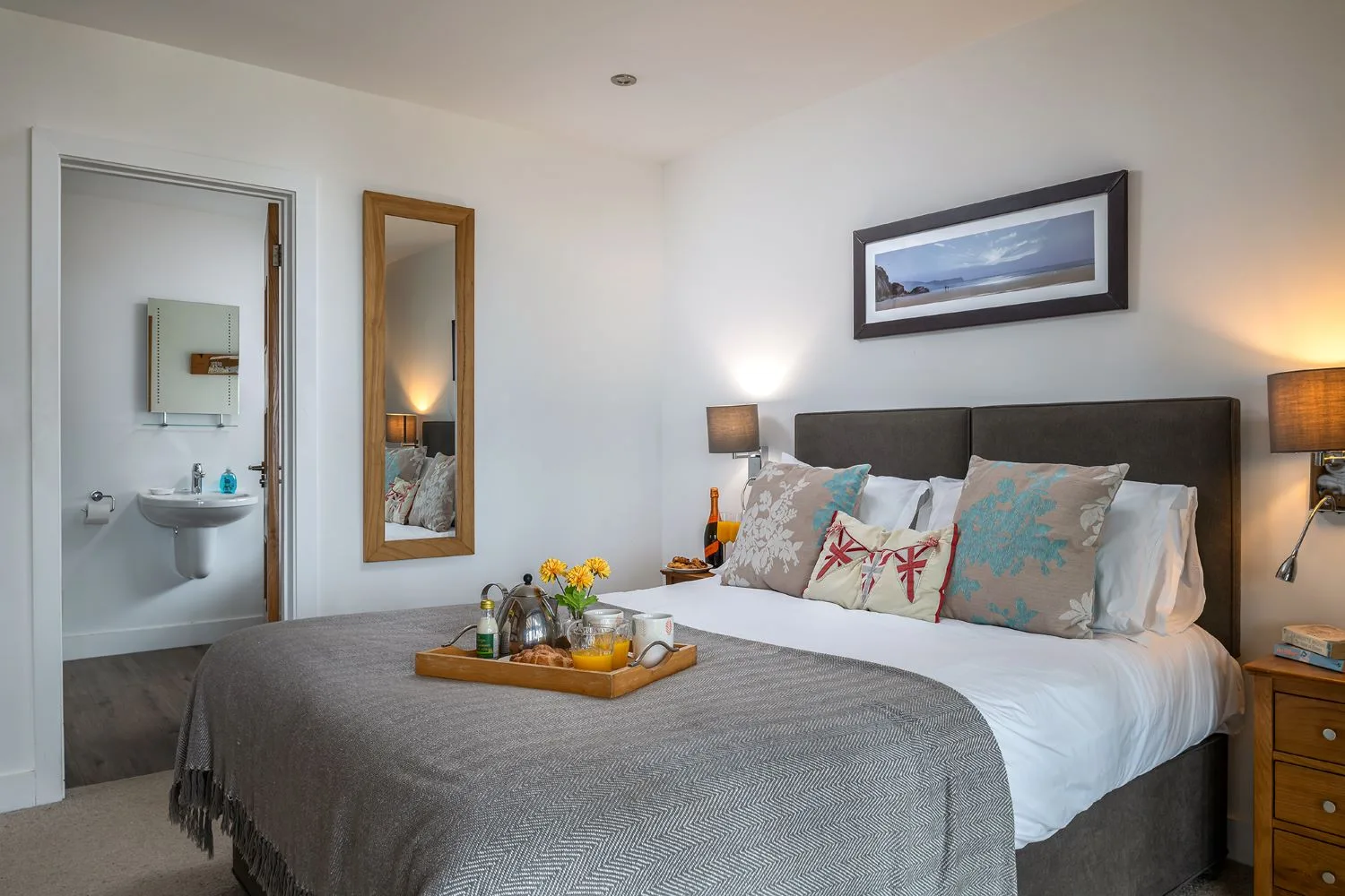 Bedroom 1: Master Superking size room with built in wardrobes, TV, dressing area, bedsides, seating area, with access to upper viewing gallery – perfect for enjoying an afternoon coffee, whilst admiring the stunning sea views. En-suite bathroom with shower cubicle, heated towel rail, WC and wash basin.