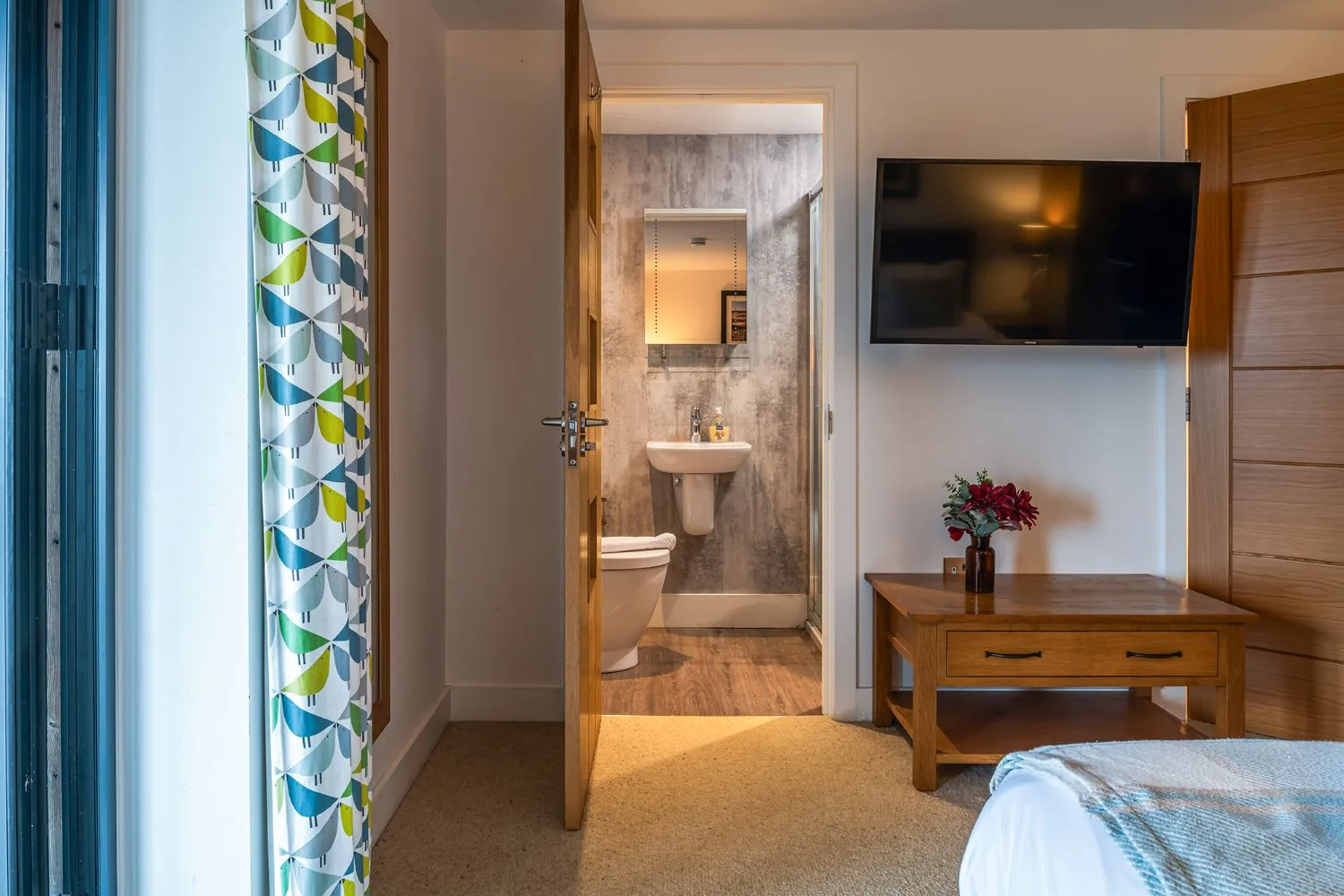 Bedroom 4: Twin bedroom (zip and link to Superking on request) with TV, chest of drawers and bedsides. En-suite bathroom with shower cubicle, heated towel rail, WC and wash basin.