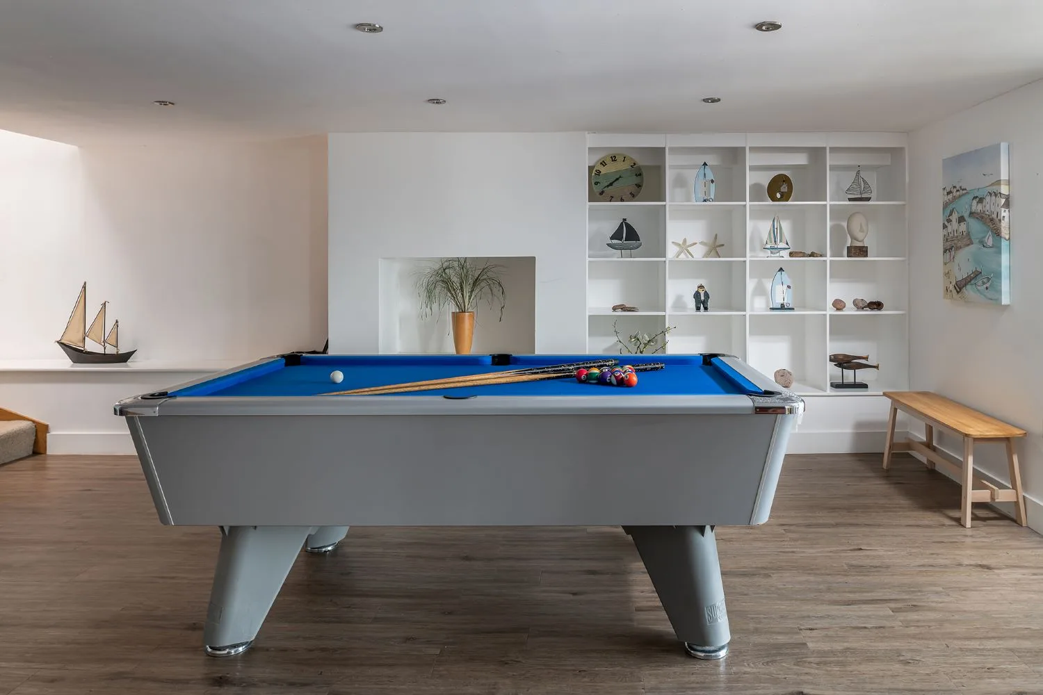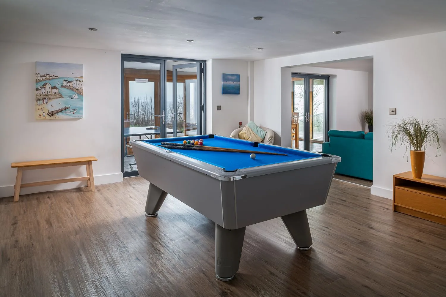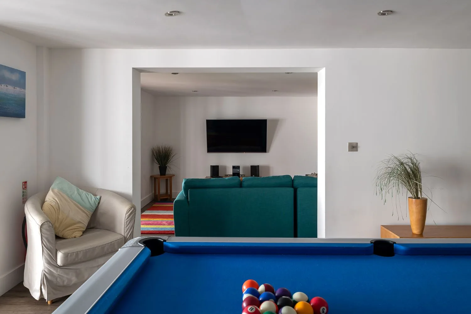 The lower ground floor offers plenty of space for relaxation and entertainment. A generously sized games room features a pool table, a conservatory area with table tennis, and a dining space, while a separate lounge with a TV provides an additional spot to unwind. This level also houses two further bedrooms, both with en-suite facilities. One is a luxurious super king room with French doors that open onto the terrace, inviting in natural light and fresh coastal air. The second is a versatile Twin bedroom with a zip-and-link option to convert into a super king. For the ultimate indulgence, the family bathroom boasts a deluxe Jacuzzi spa bath complete with Wi-Fi and mood lighting, offering a truly relaxing retreat. Additionally, a convenient utility room is located on this floor, equipped with a washer/dryer and an extra fridge.