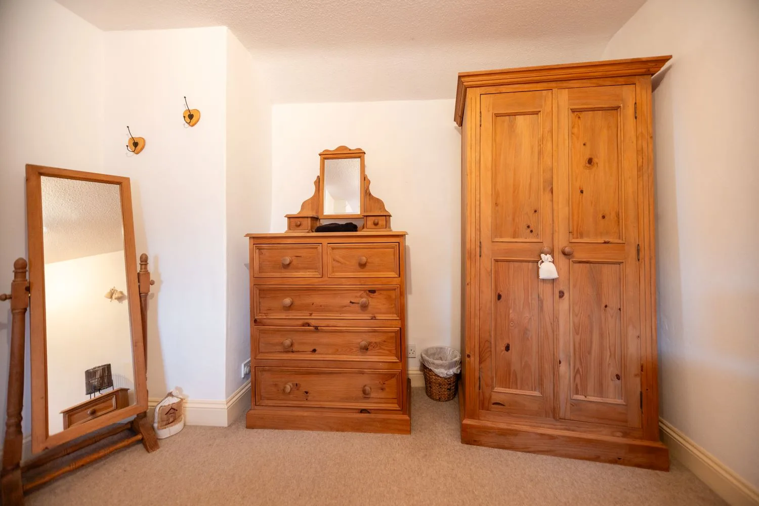Bedroom 2 (1st Floor): Twin bedroom with wardrobe, chest of drawers and TV.