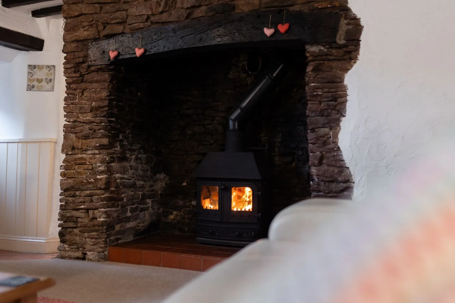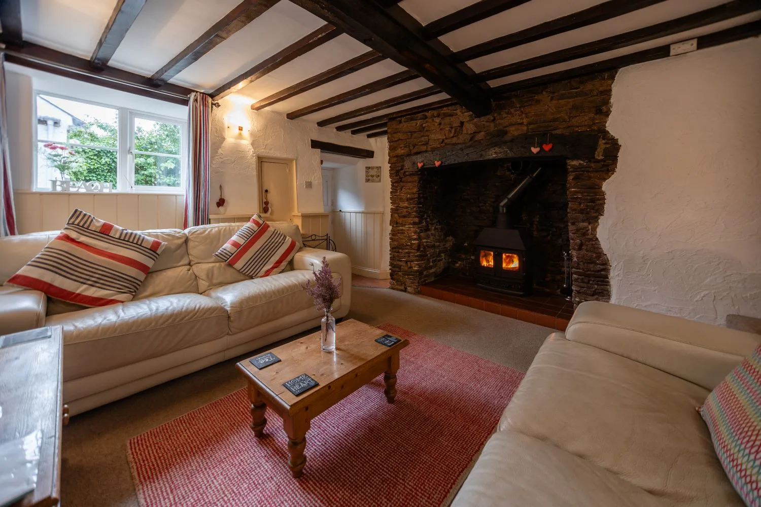Living room: Two comfortable 2-seater sofas and wood burner in Inglenook fireplace. Large Smart TV with Satellite channels and DVD player.